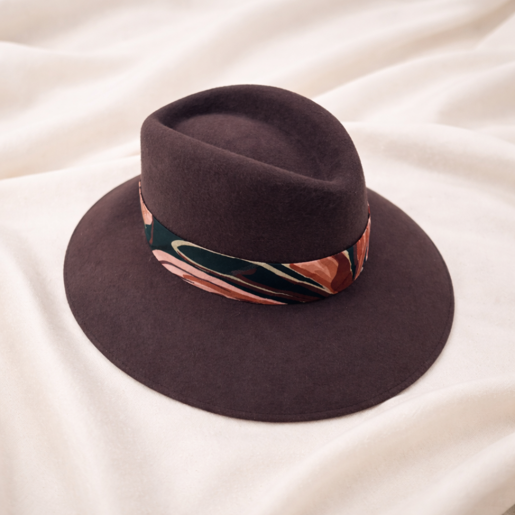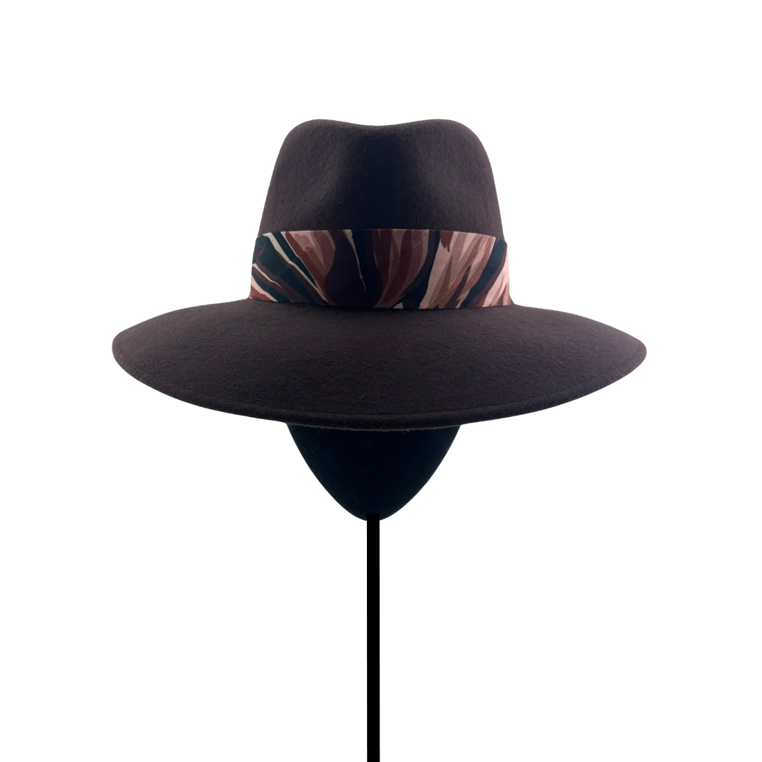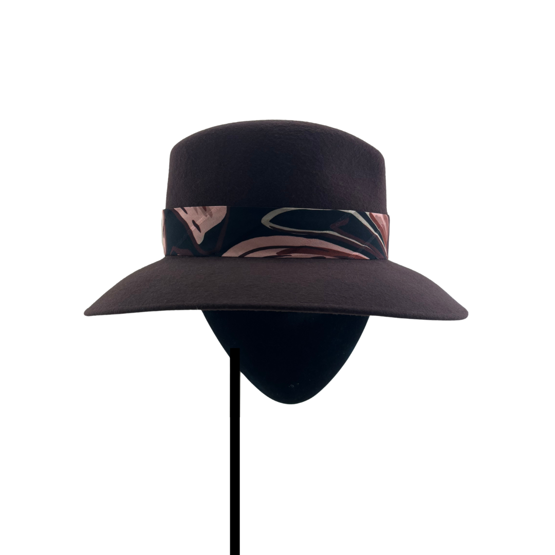 Sombrero de fieltro de lana marron con cinta estampada en tonos burdeos, marrones y rosa.