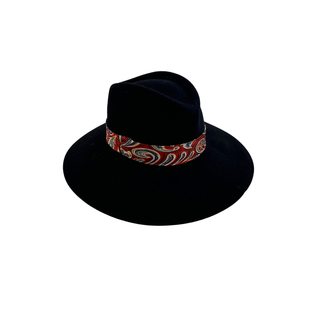Sombrero de fieltro de lana negro con cinta de raso con estampado de paisley caldero, beige y berenjena.