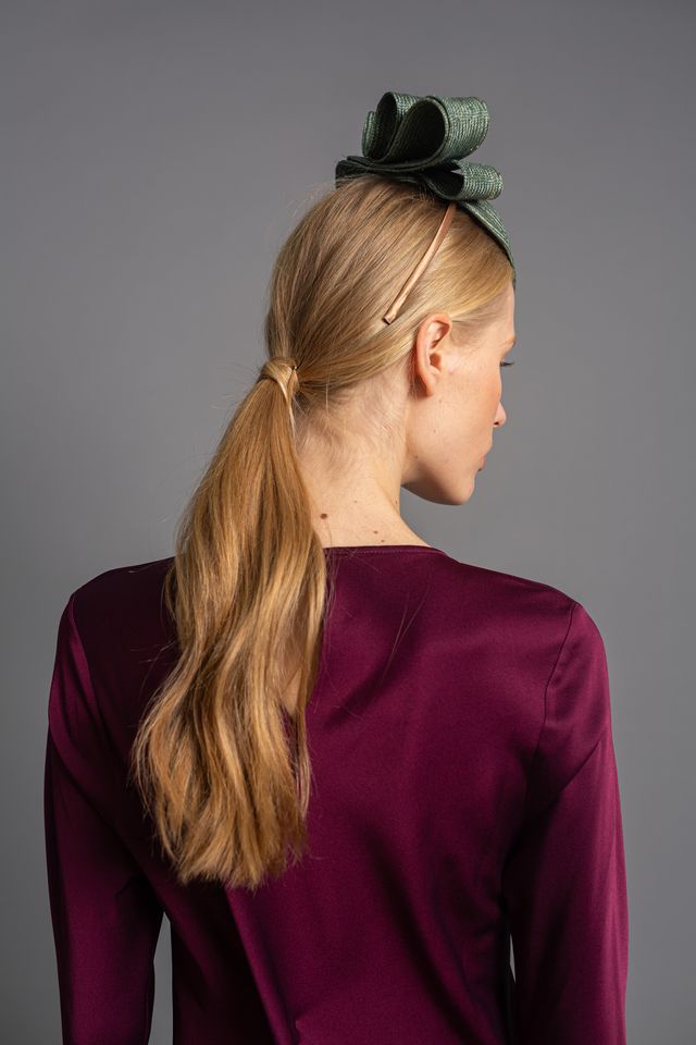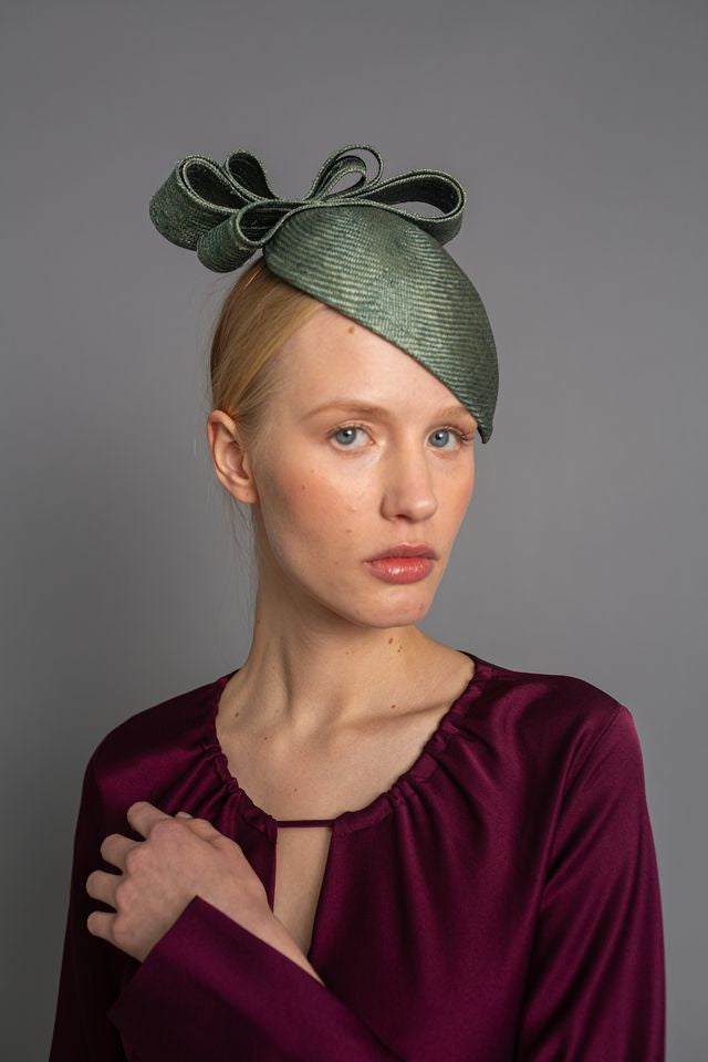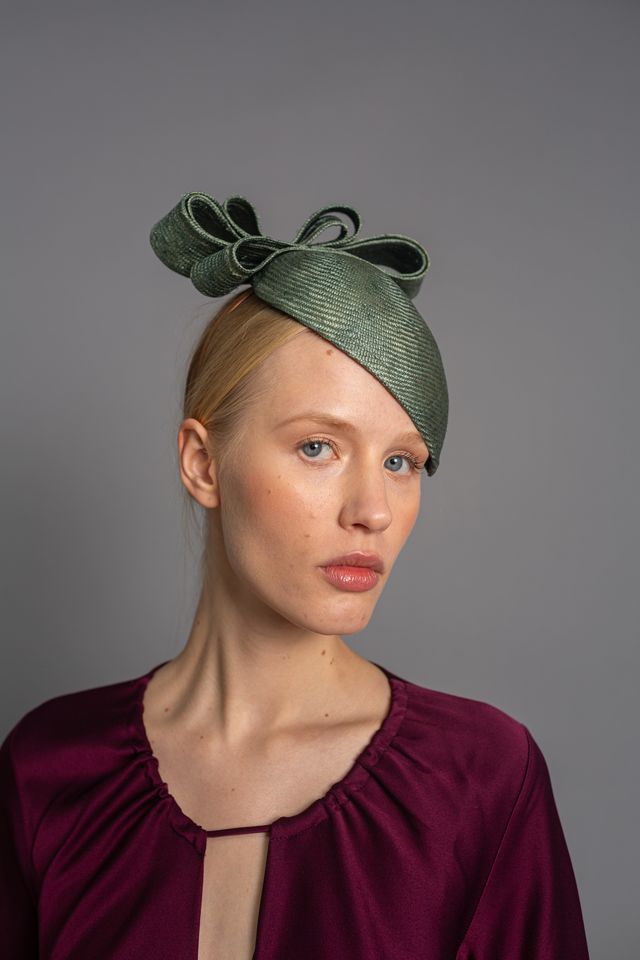 Casquete de parasisal verde grisáceo con lazada al tono.