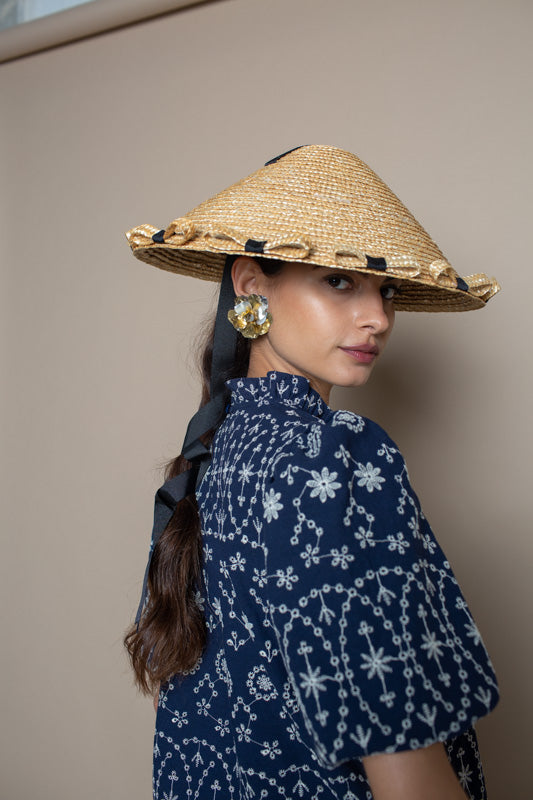 Sombrero tipo tailandés de paja natural con lacitos alrededor y con cinta negra para atar al cuello