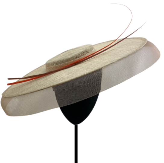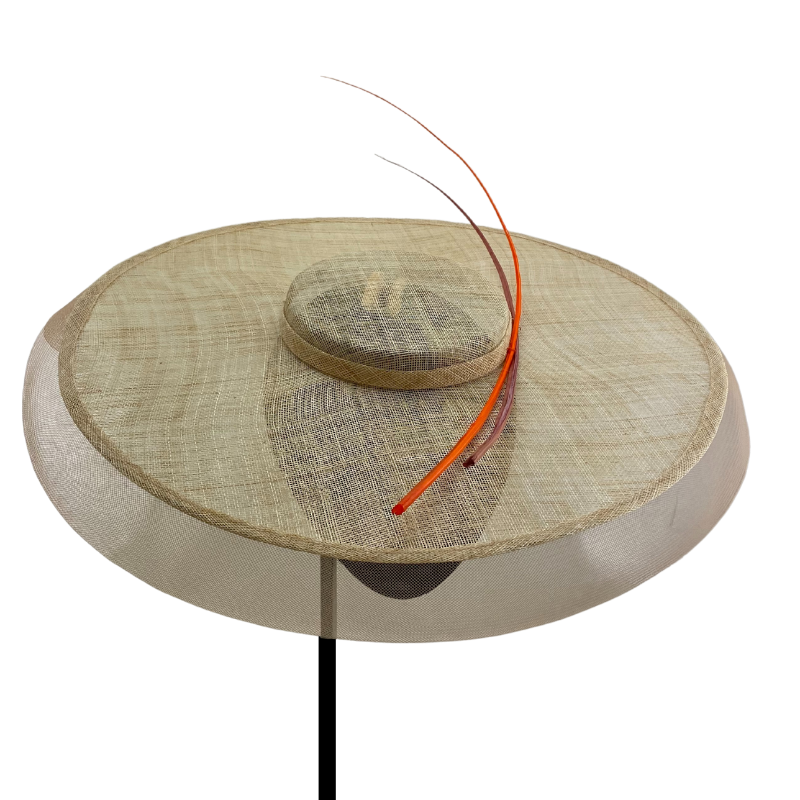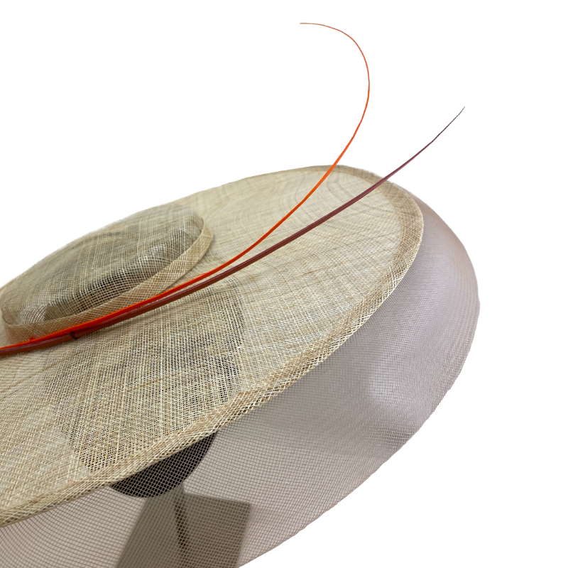 Pamela de sinamay natural con crin al tono y dos raquis naranja y rosa