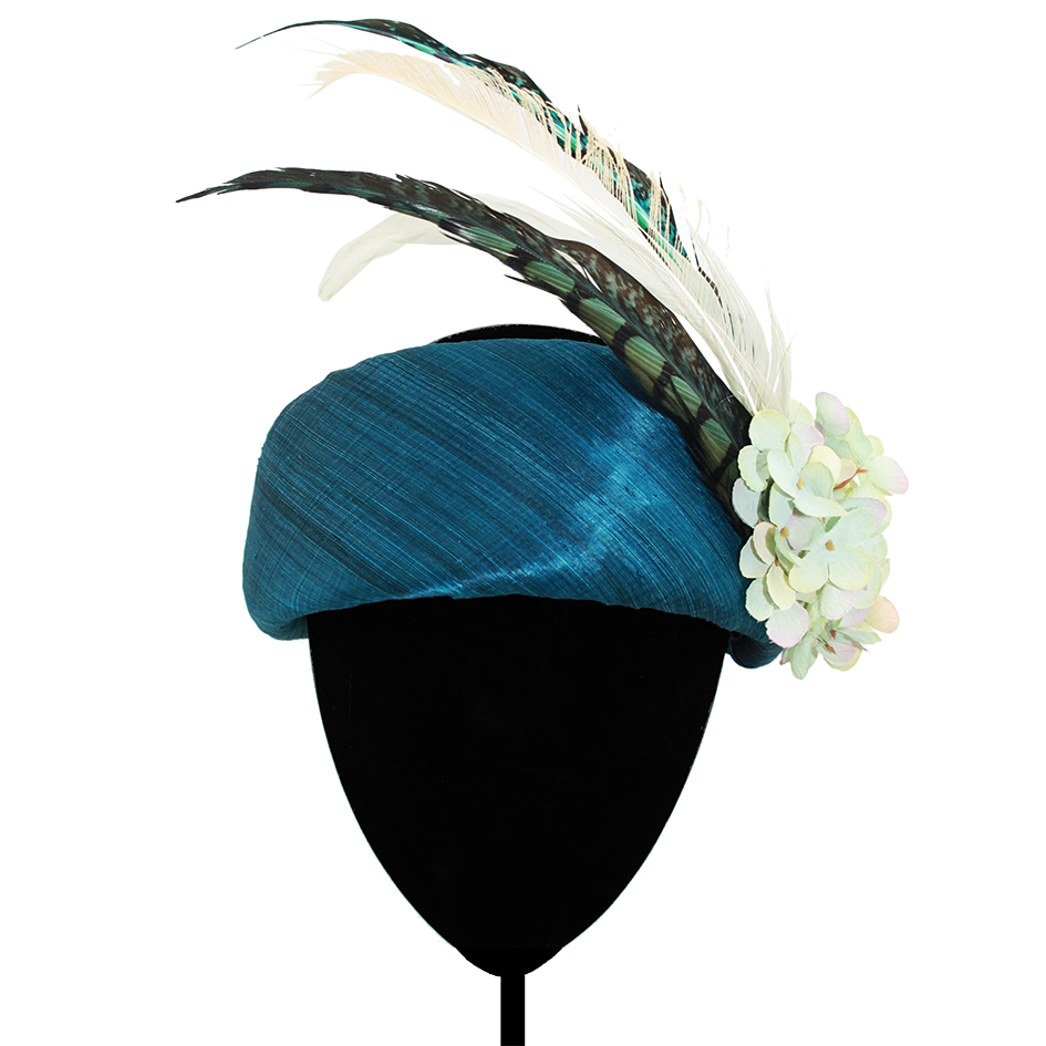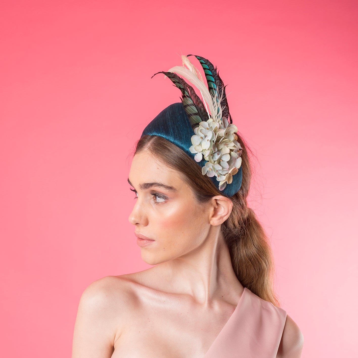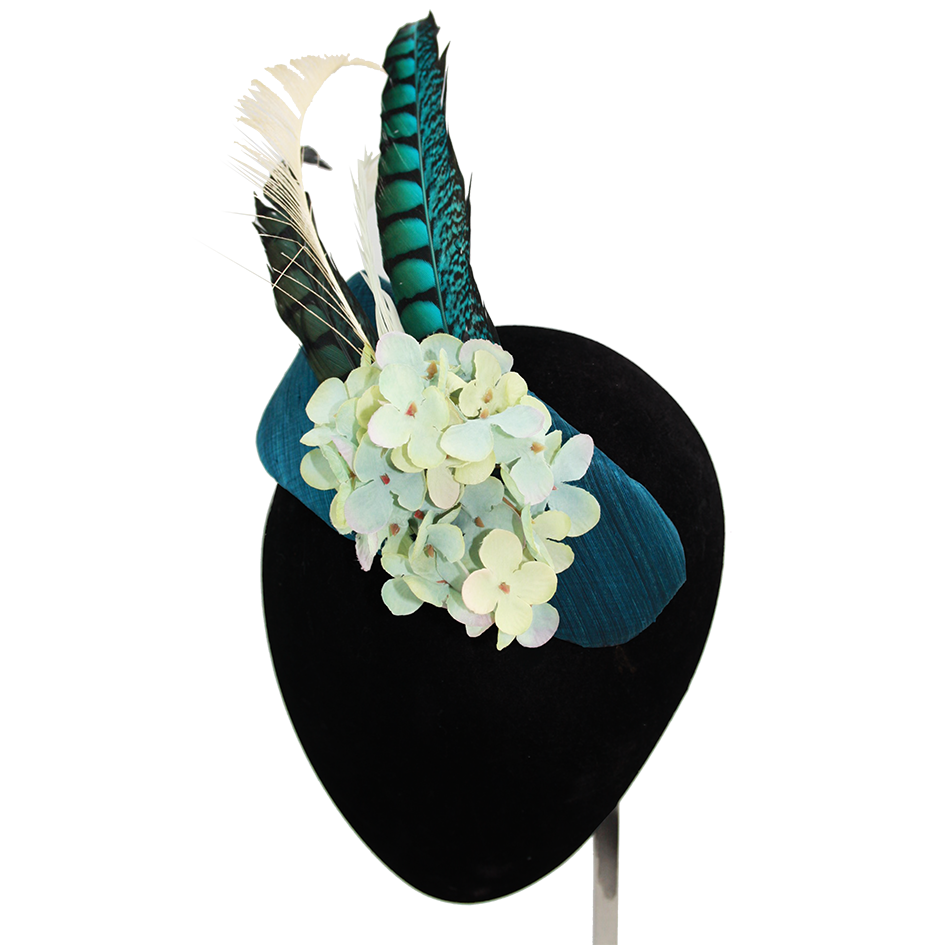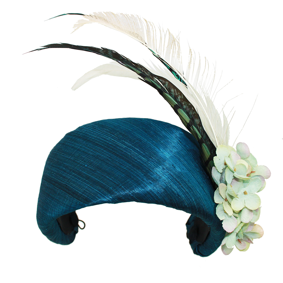 Diadema en rafia de seda verde esmeralda con conjunto de plumas de faisan al tono laterales