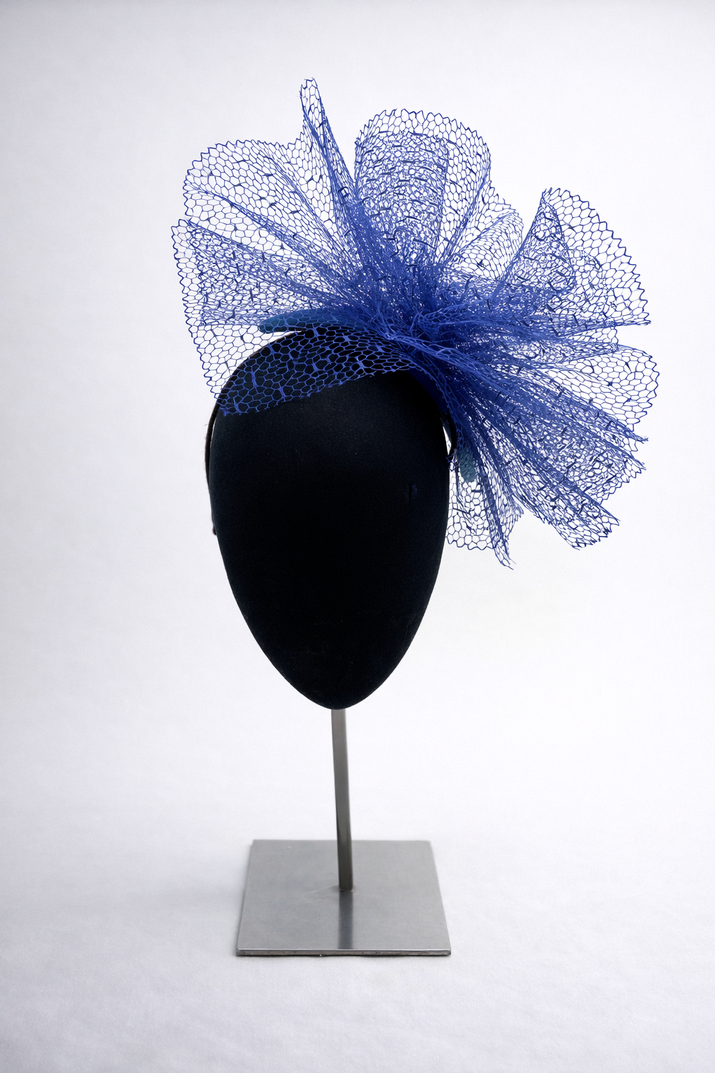 Diadema fina con hoja forrada en sinamay azul klein y abanico de velo al tono.