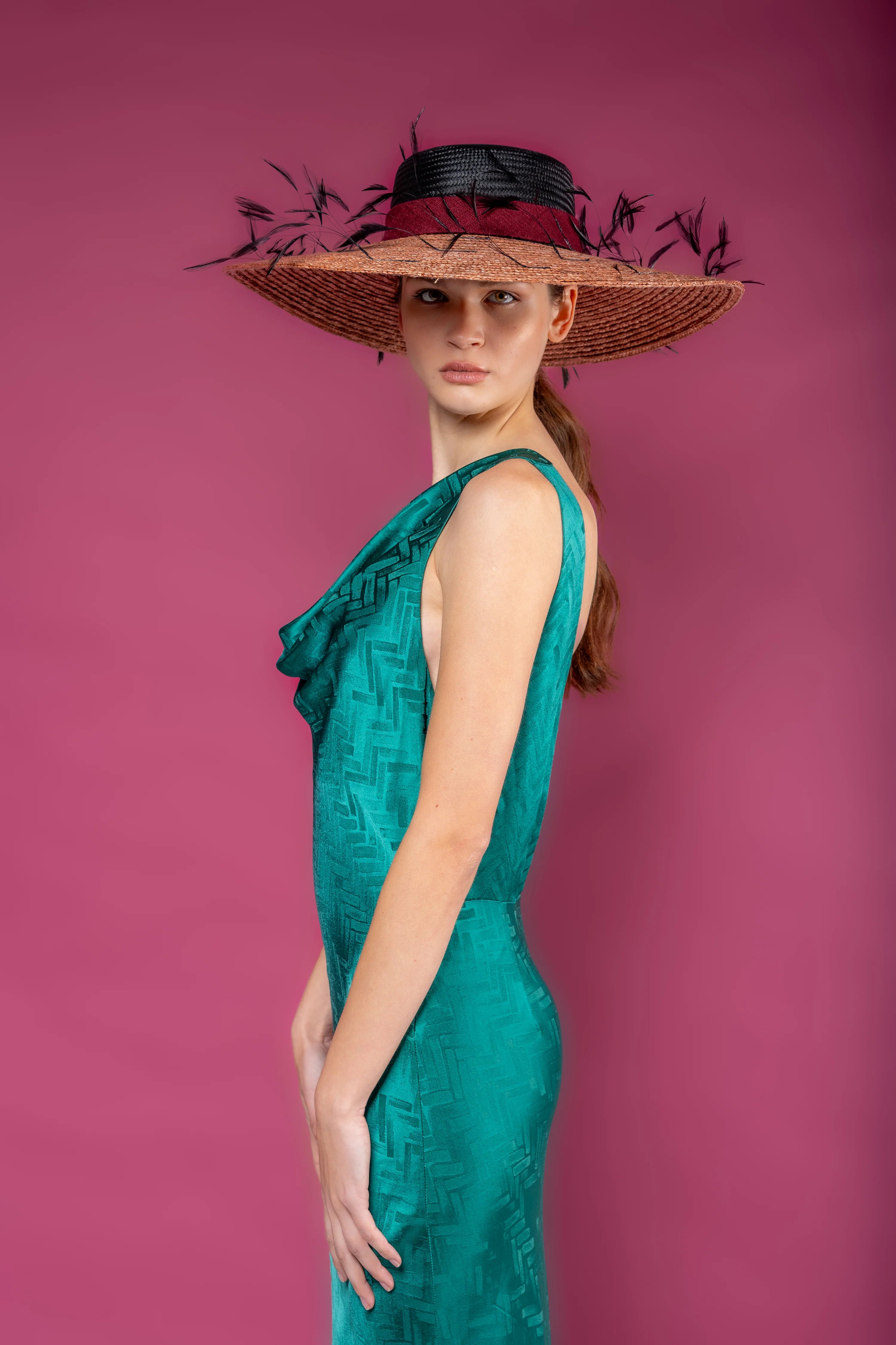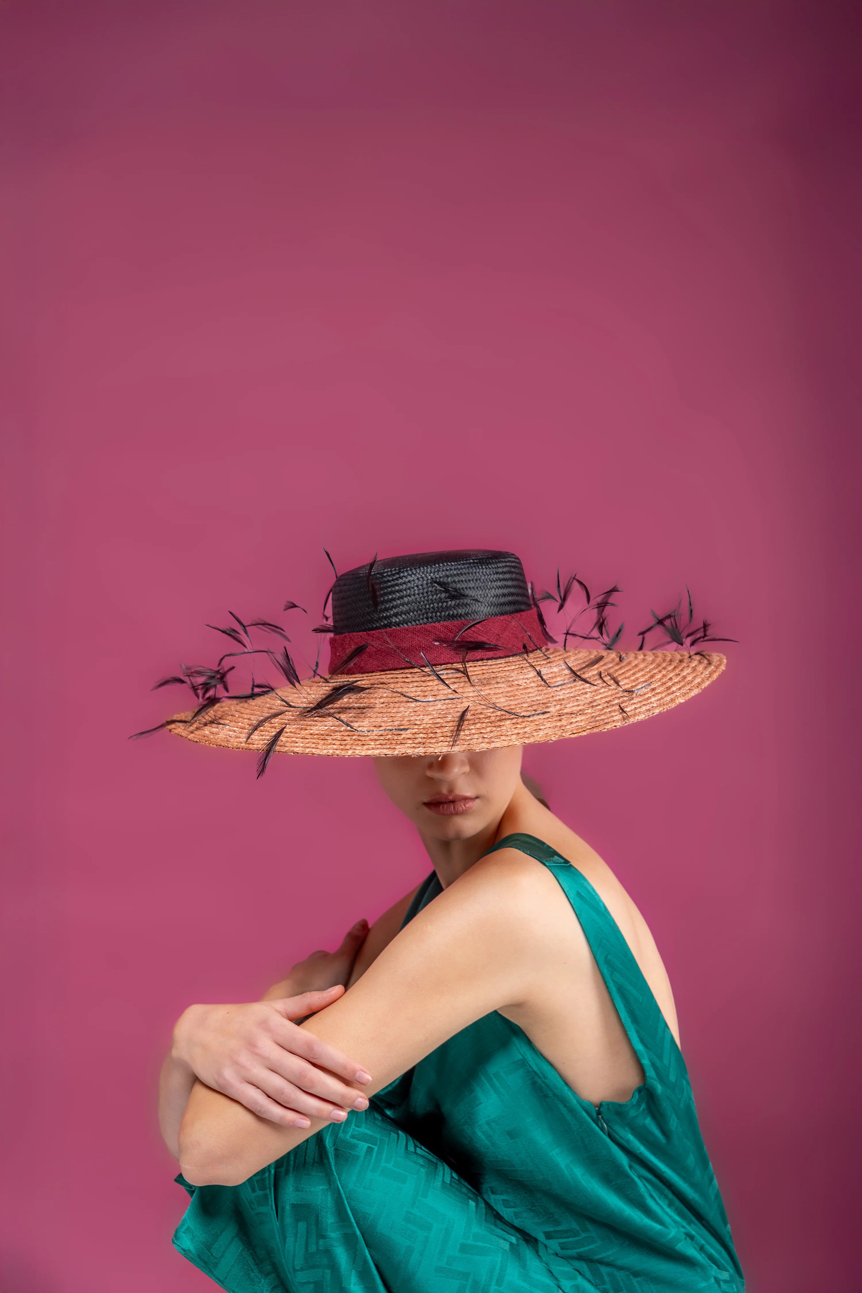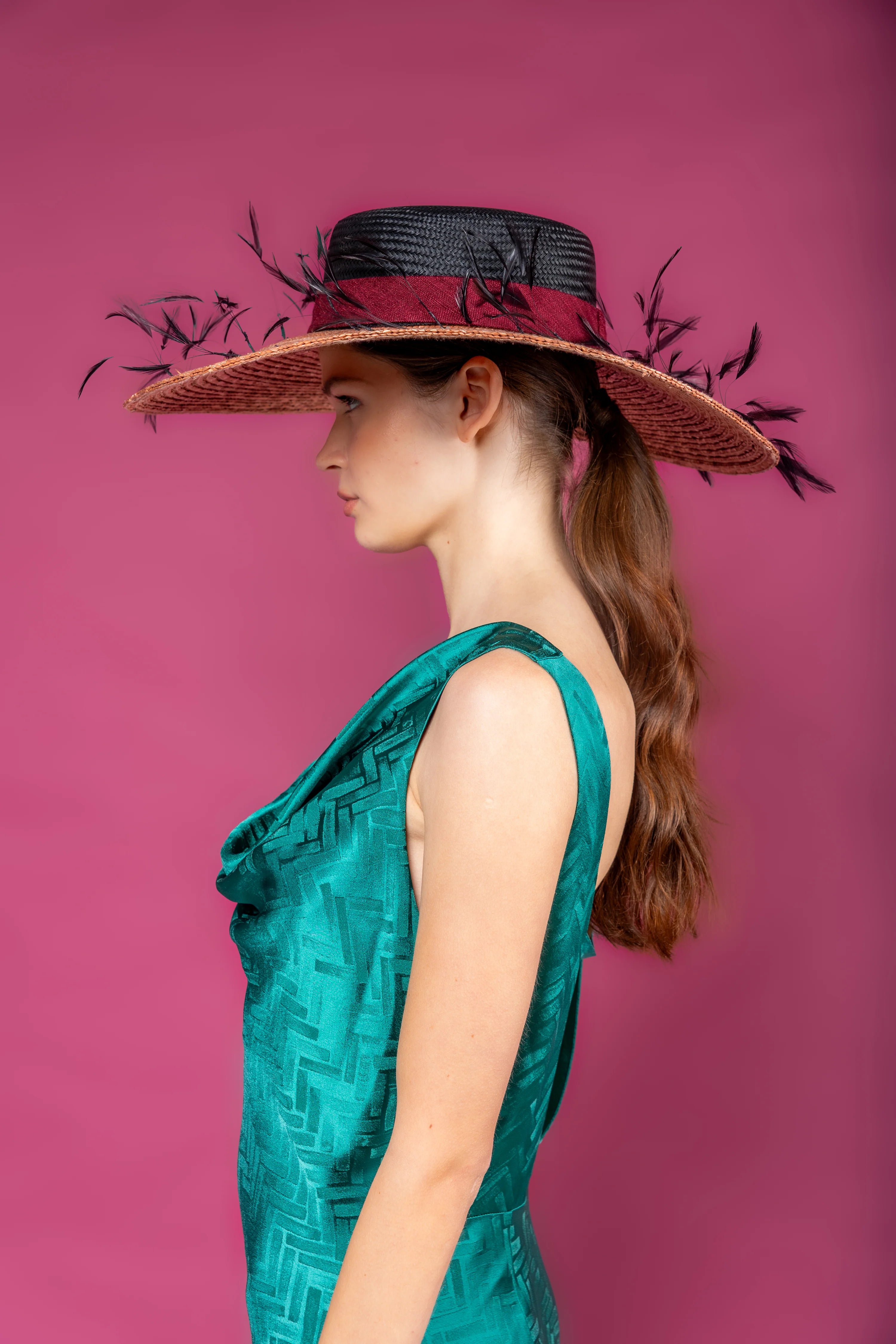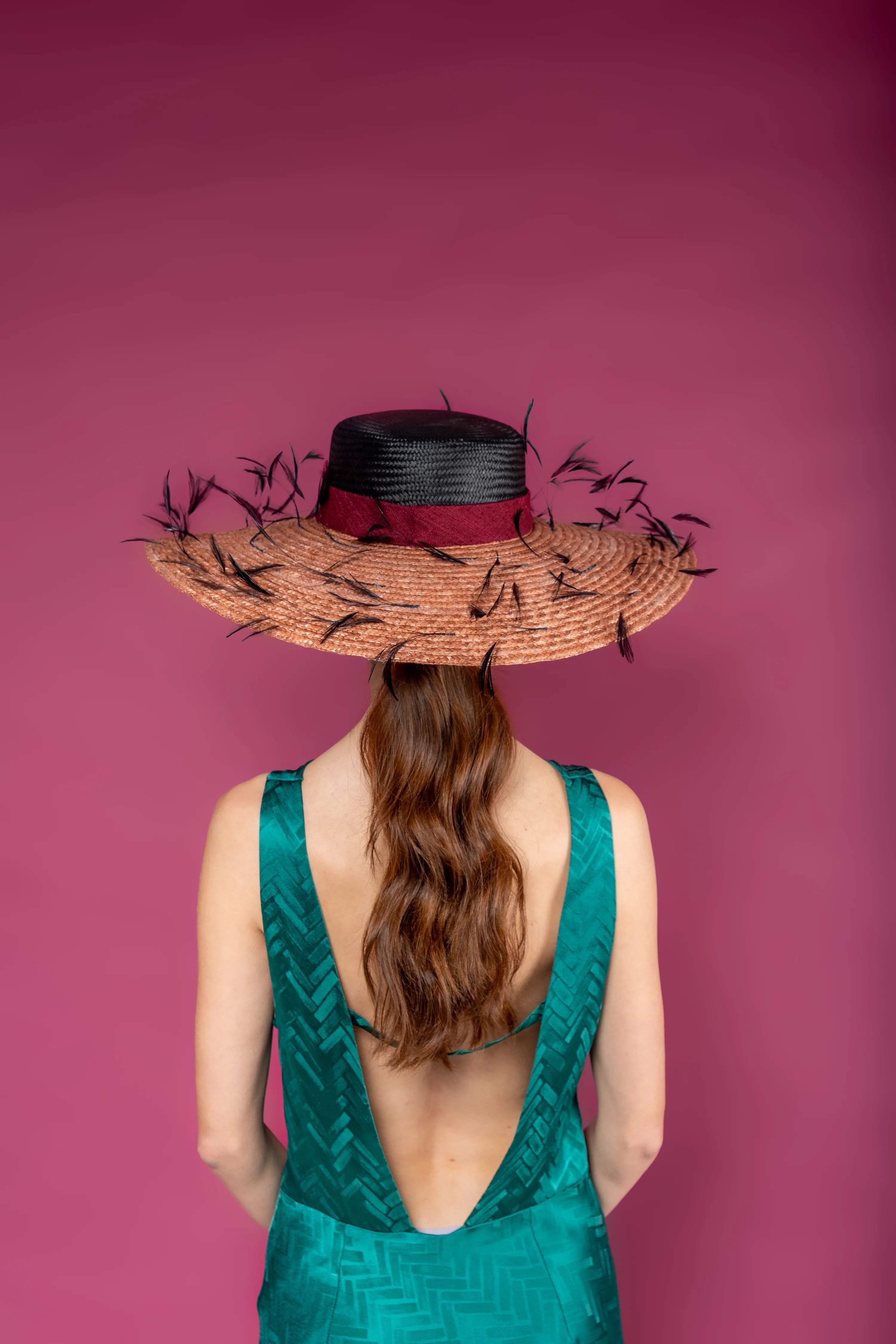 Pamela de parasisal negro con ala de rafia en rosa palo, cinta granate y plumas negras