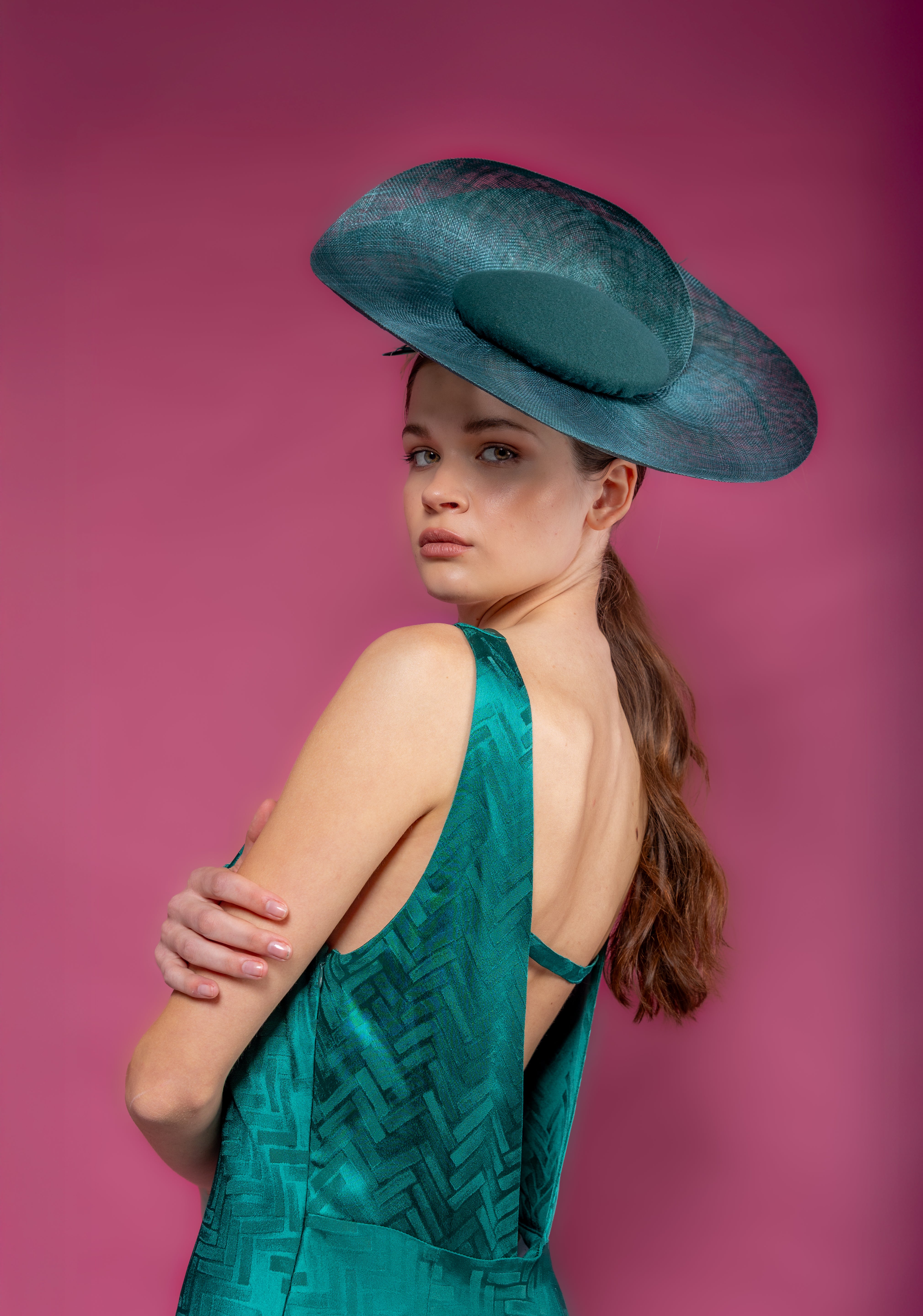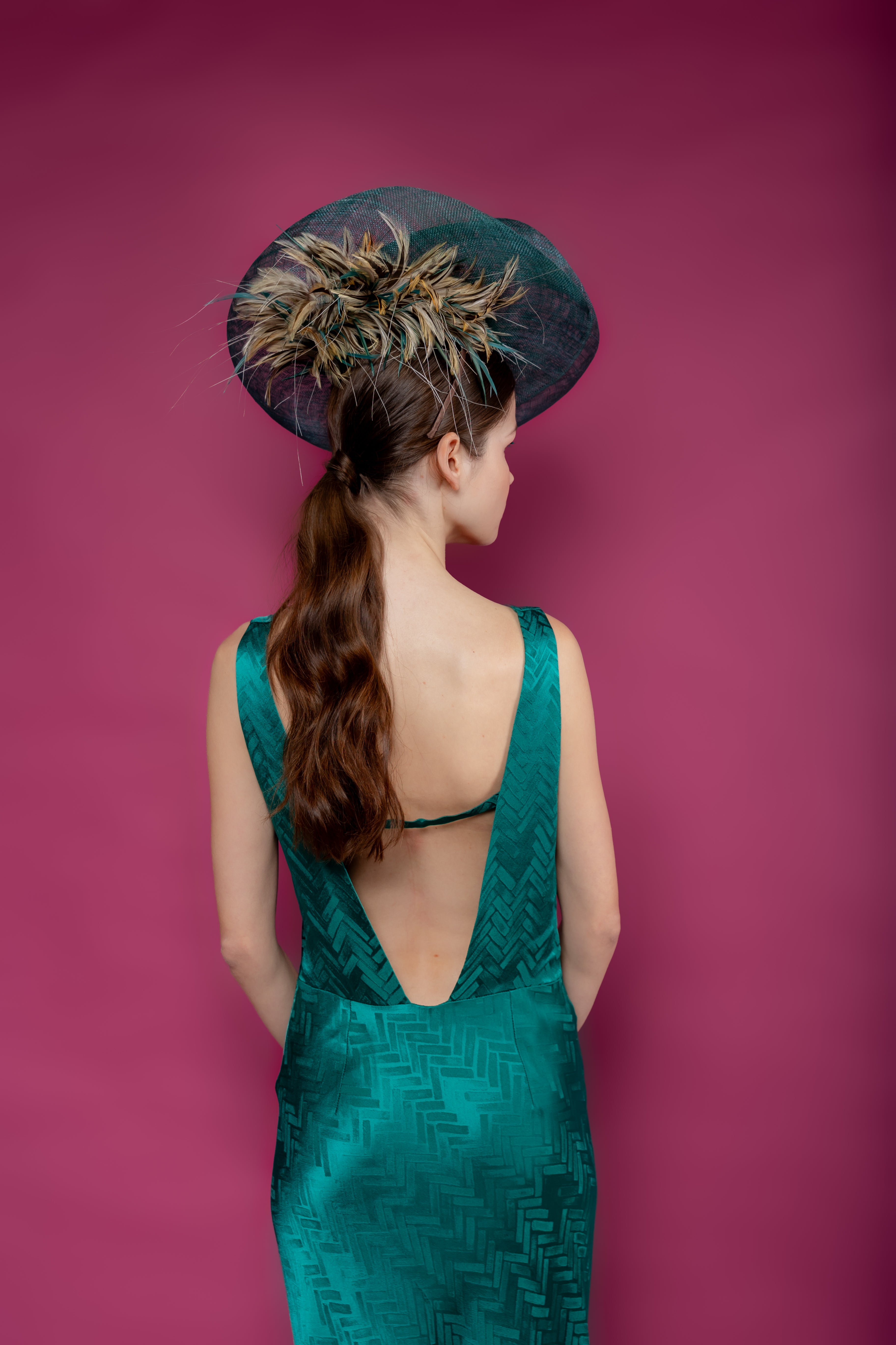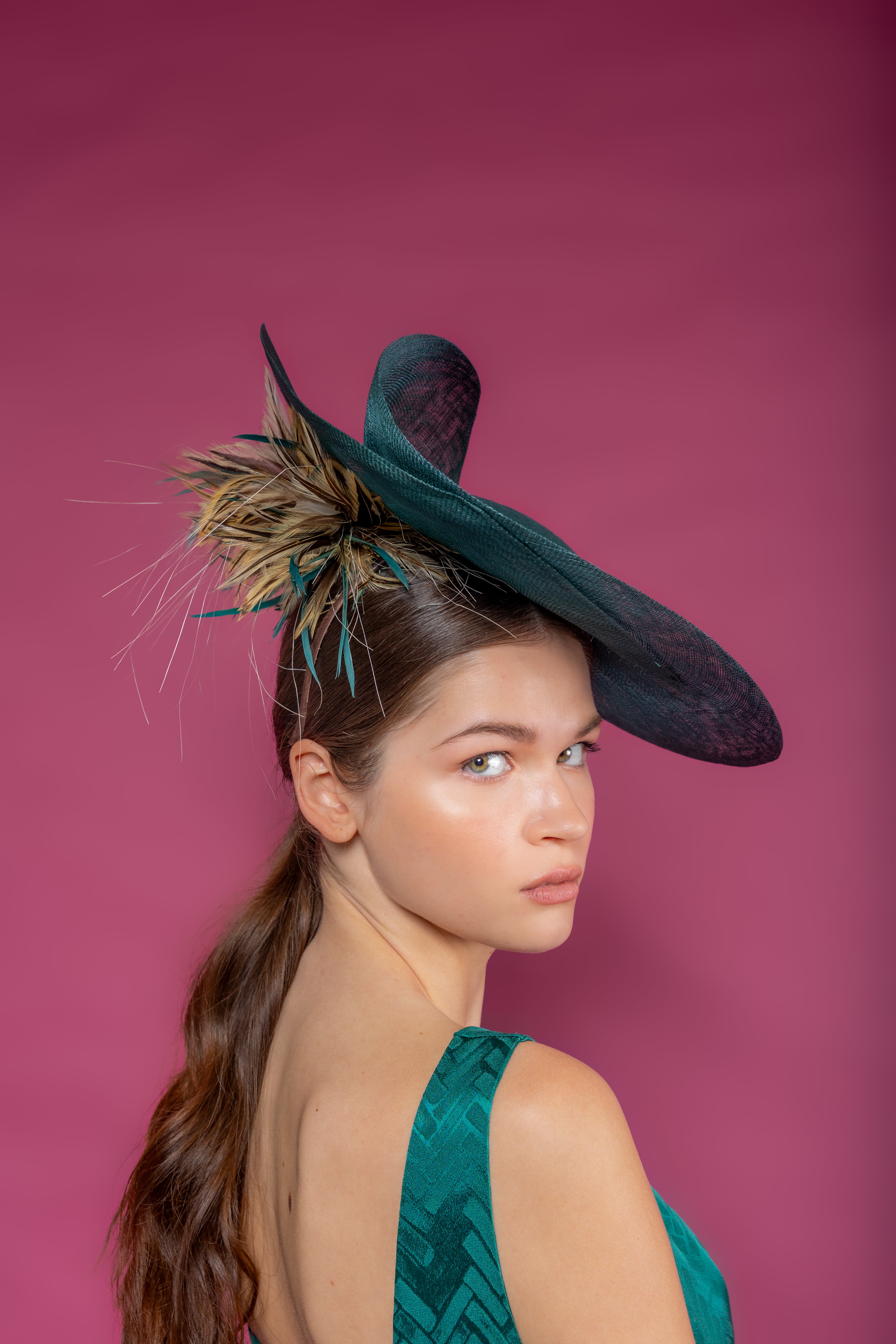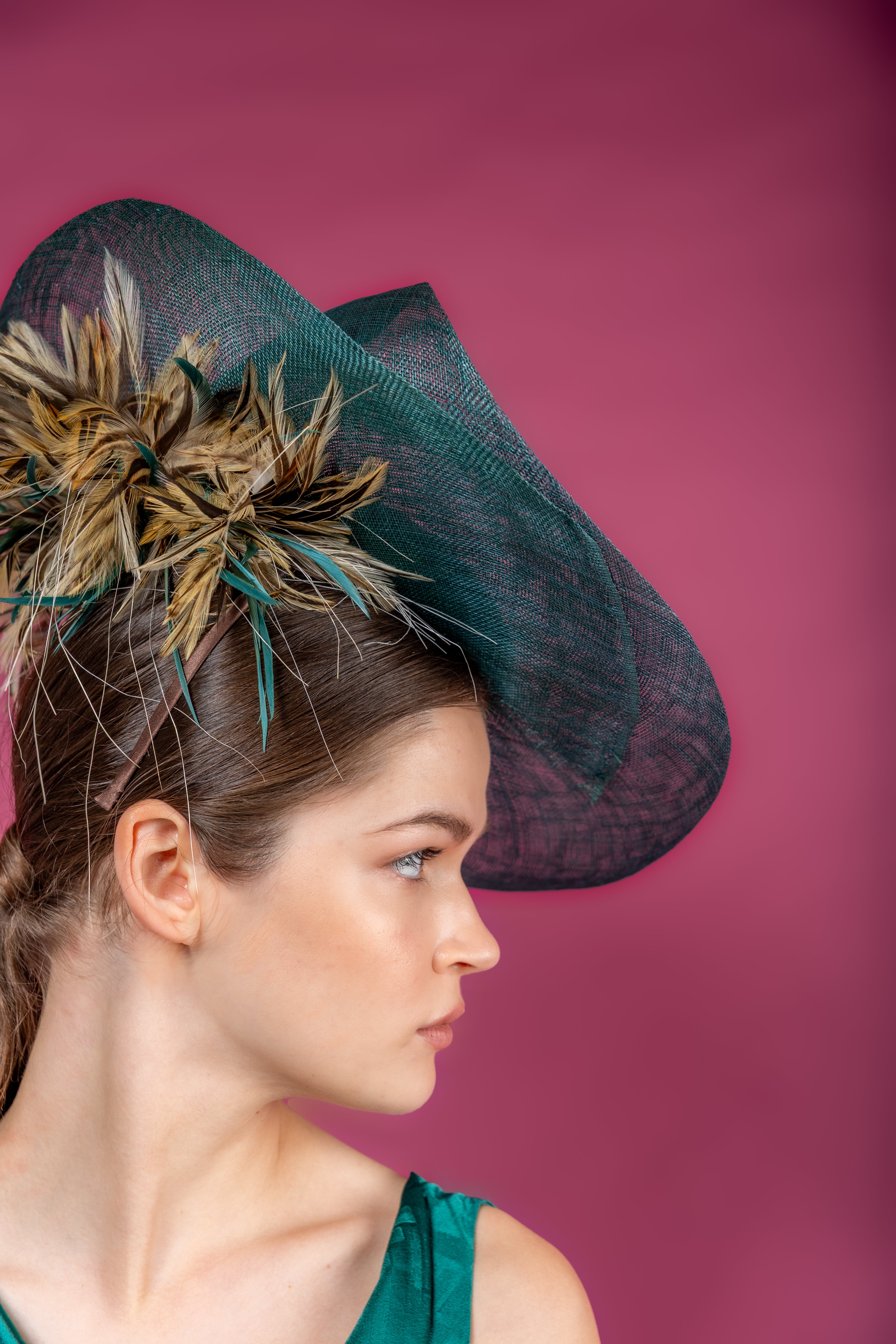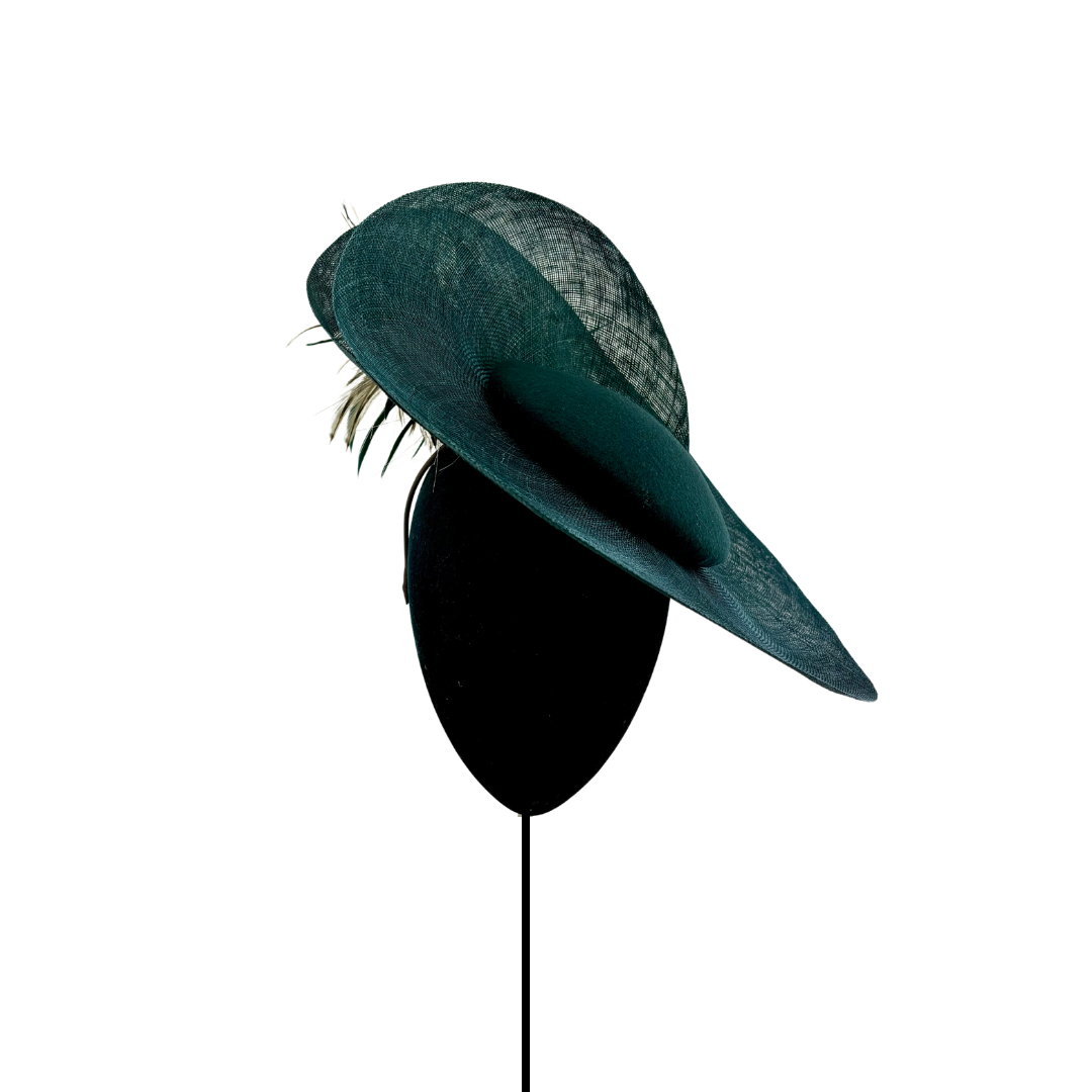 Dulcinea con base de fieltro de lana verde y ala levantada de sinamay al tono y plumero marrón detrás.