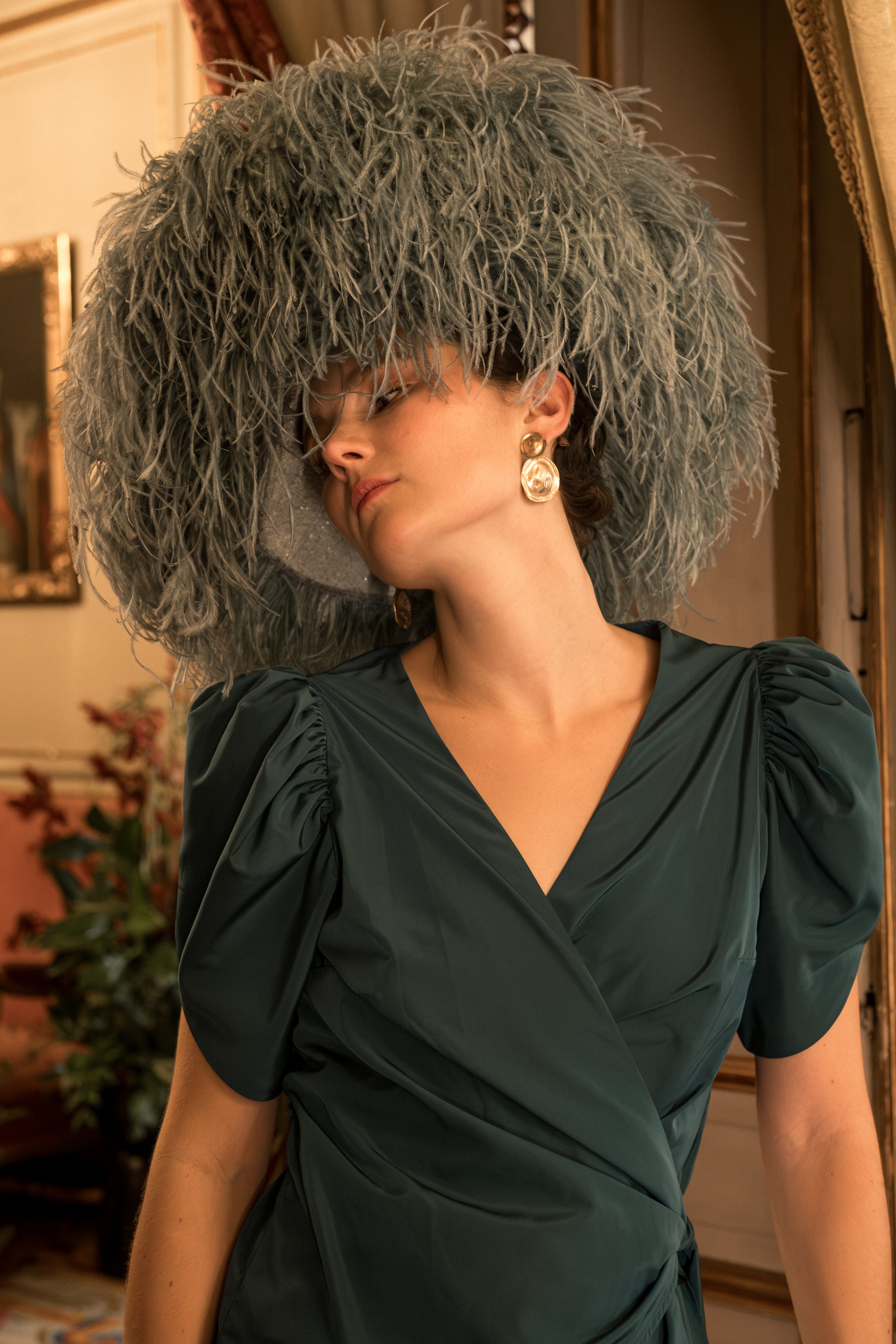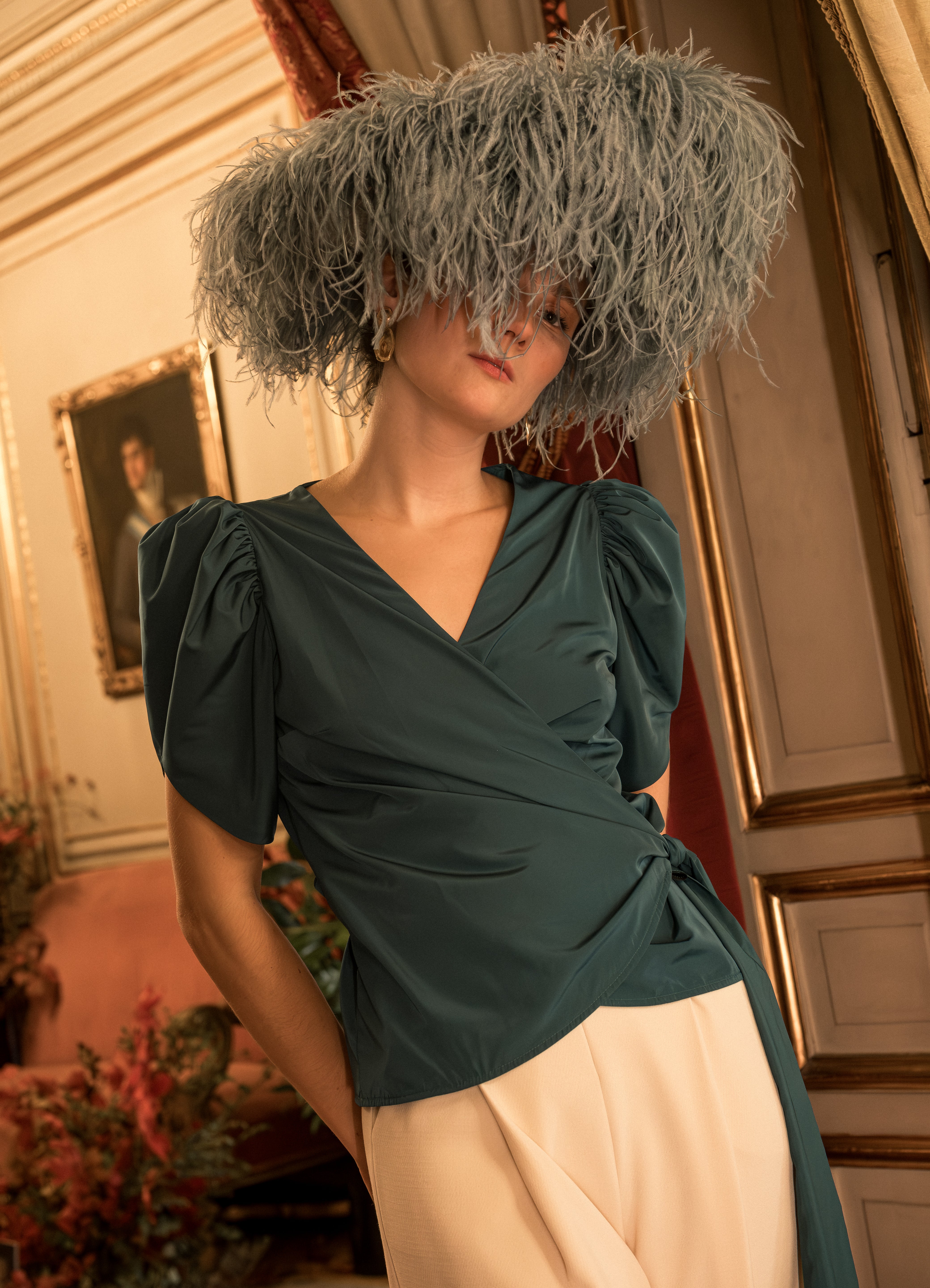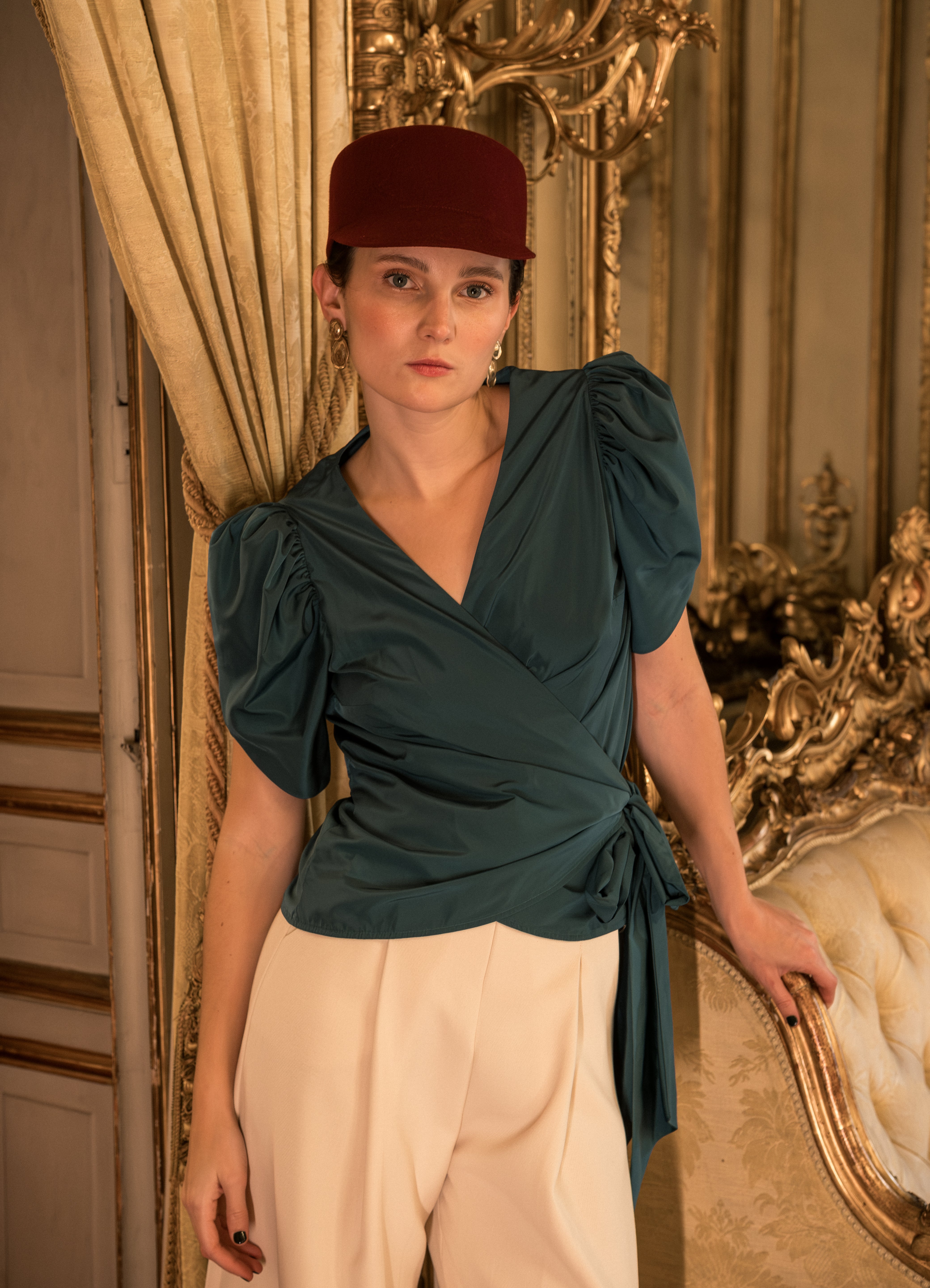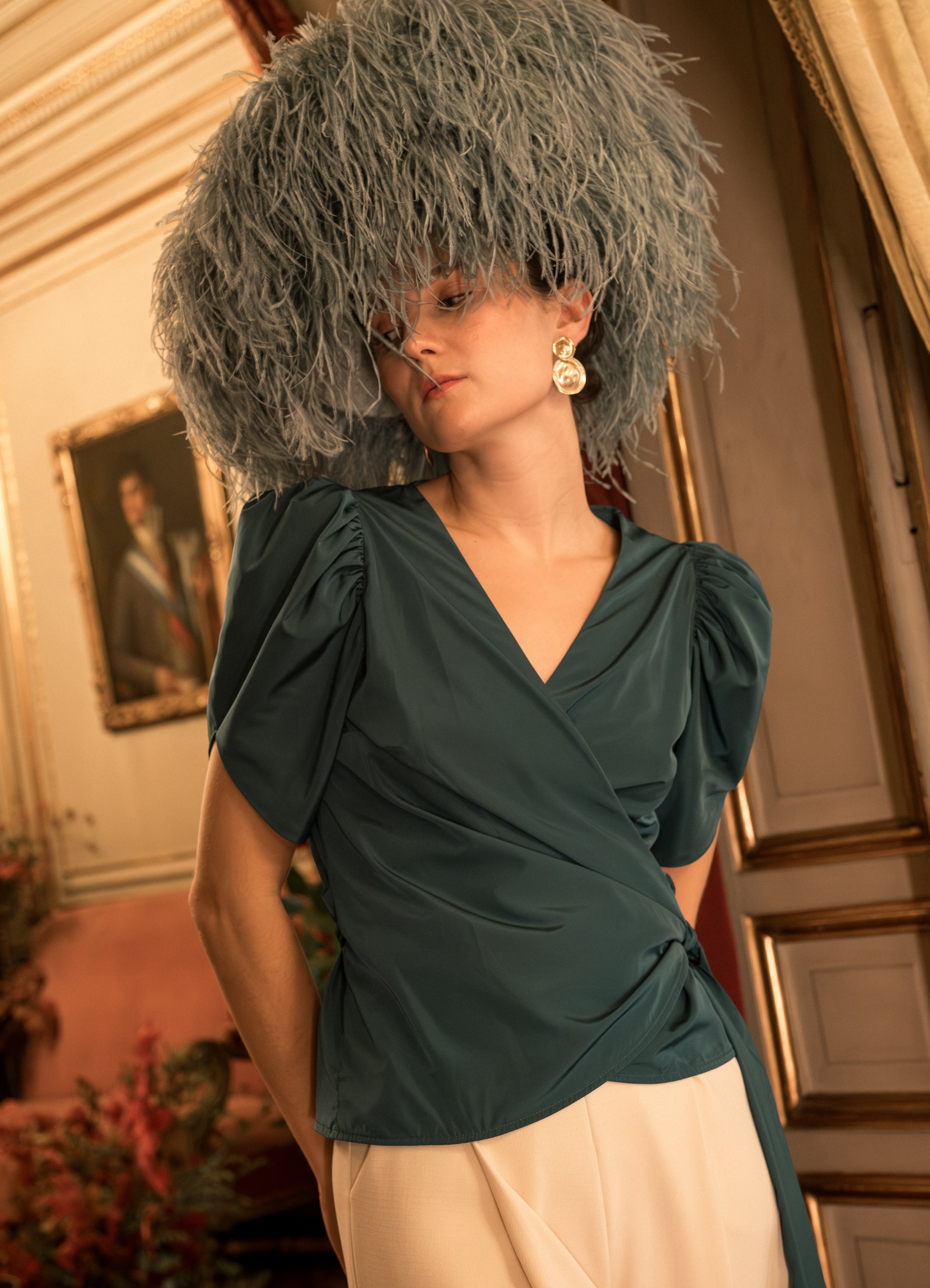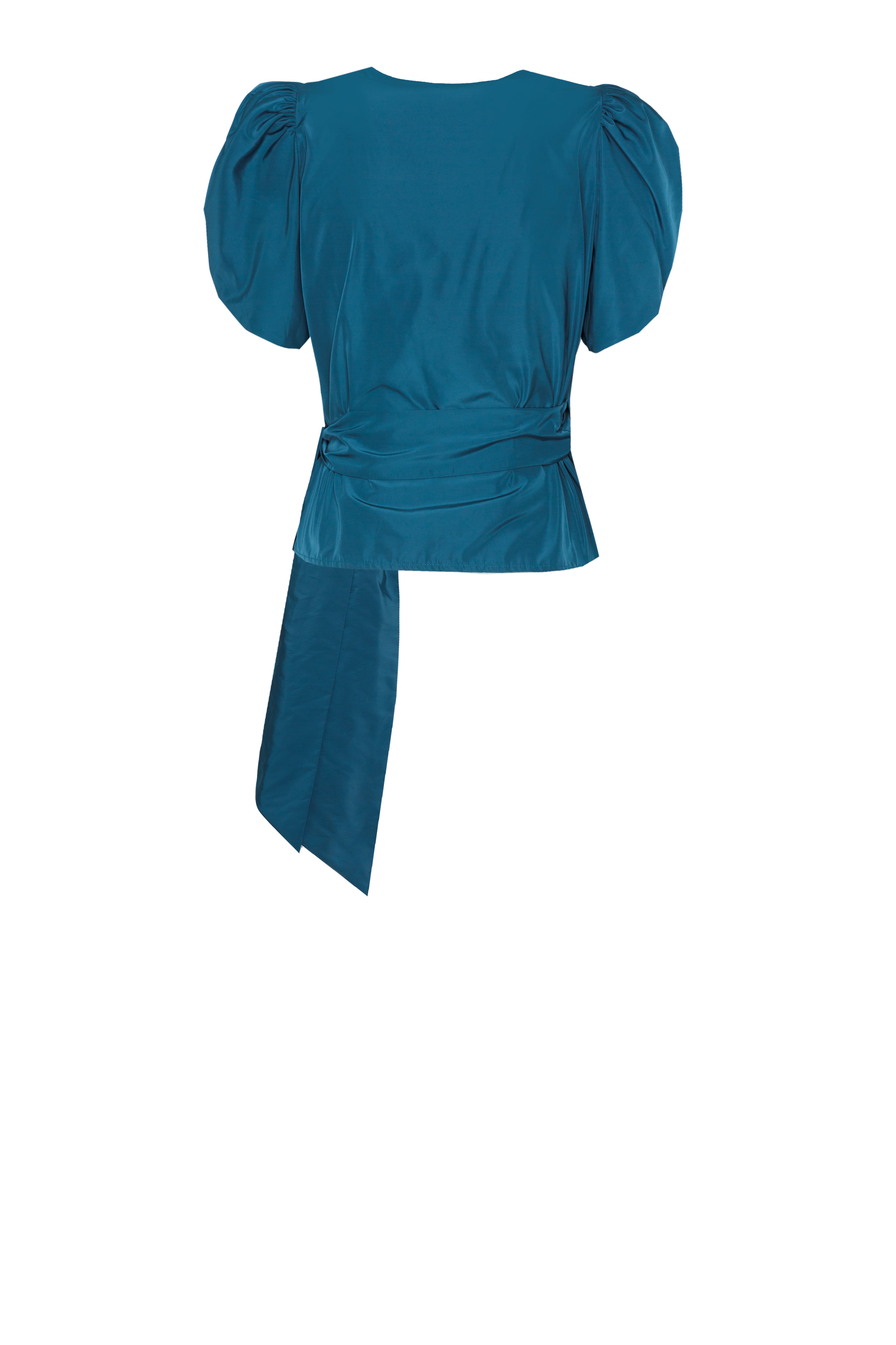 Camisa con manga abullonada, escote en V y anudado a la cintura