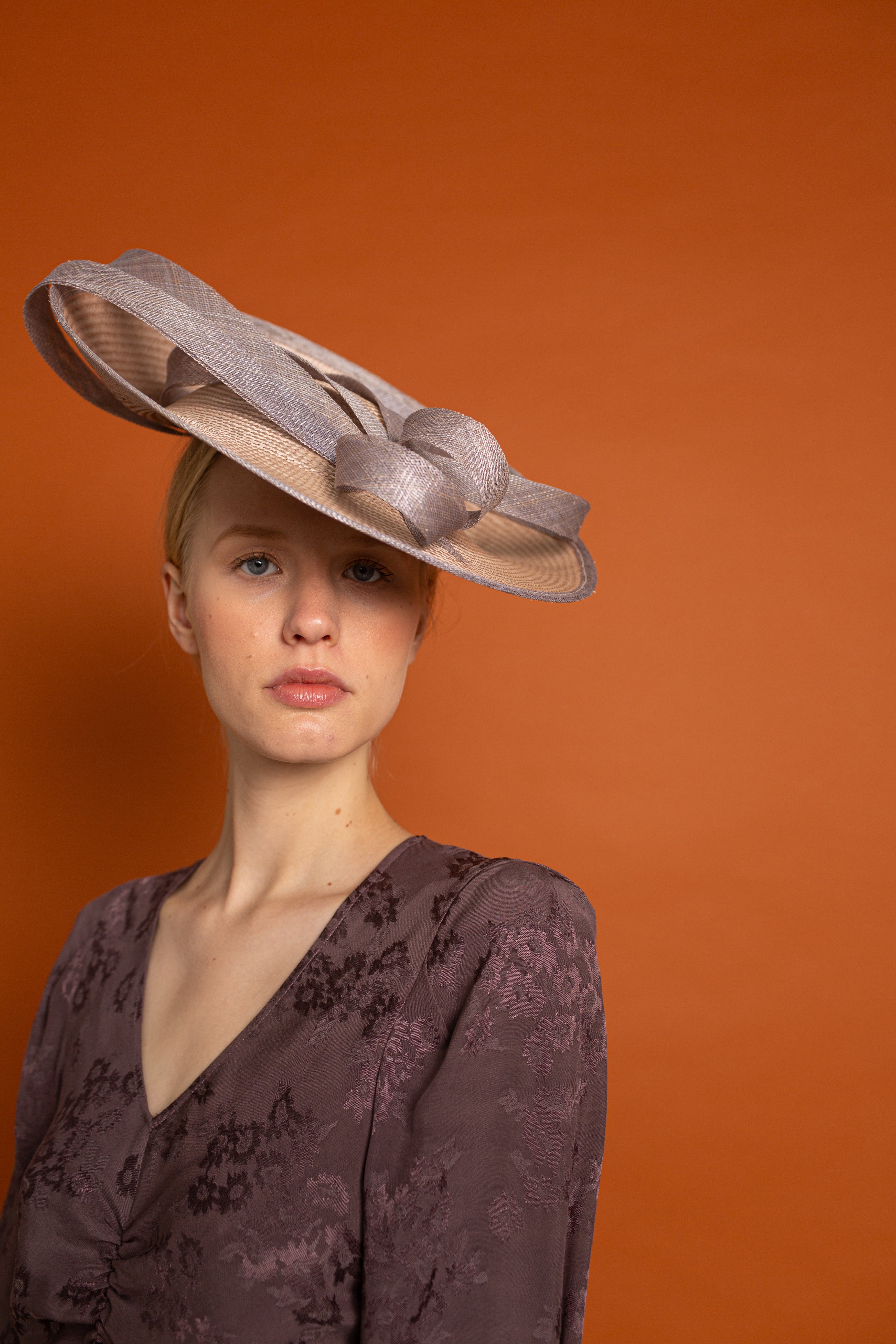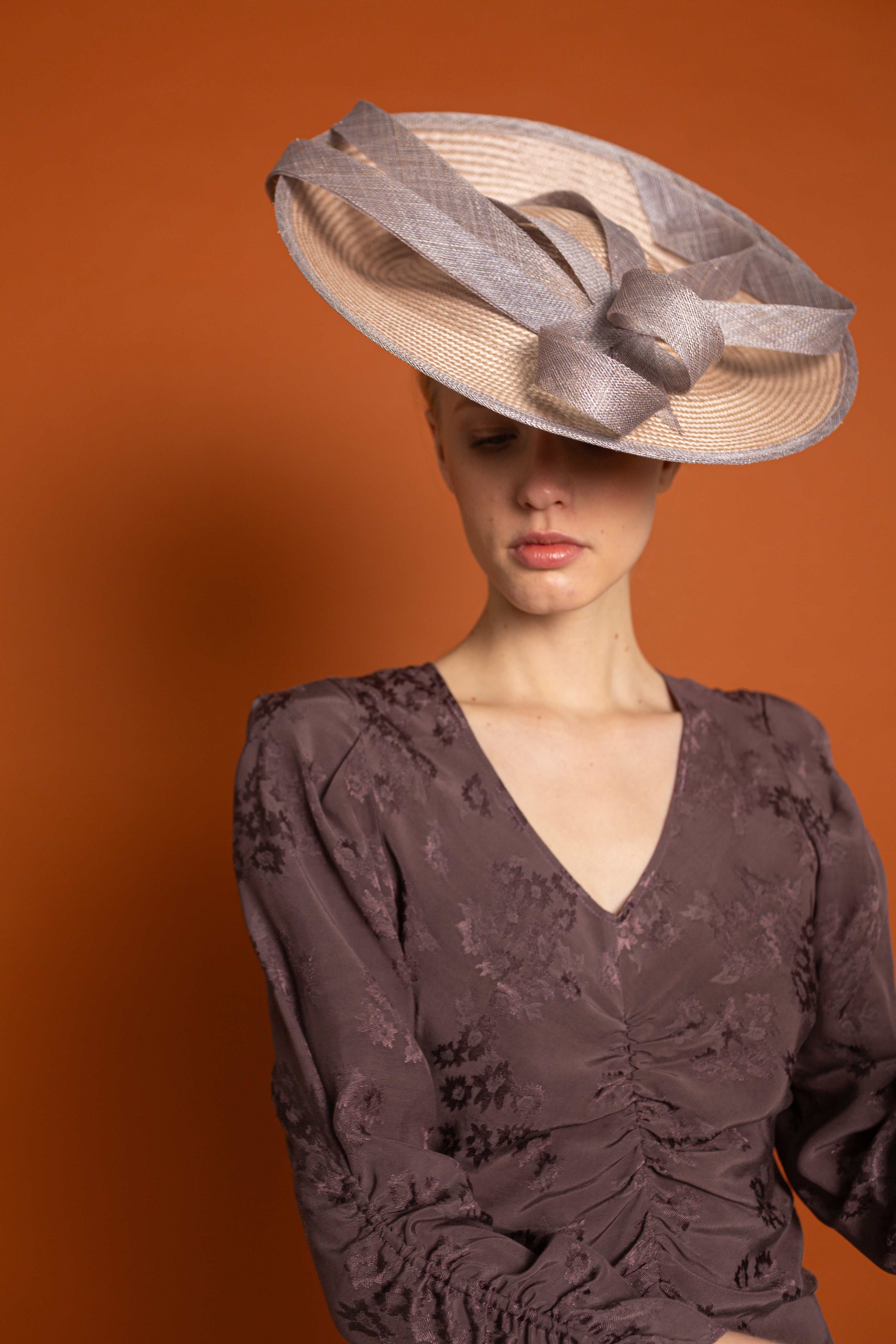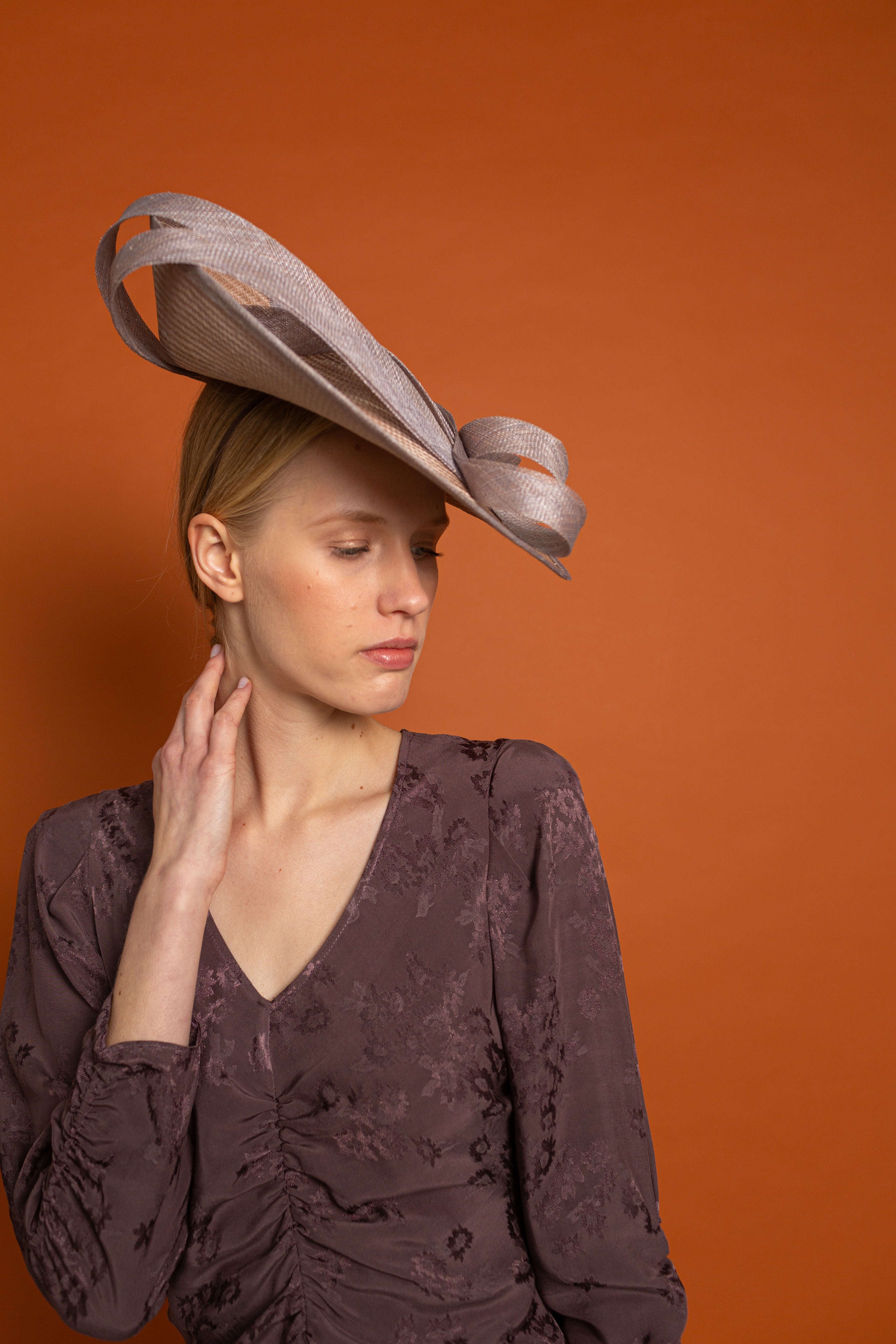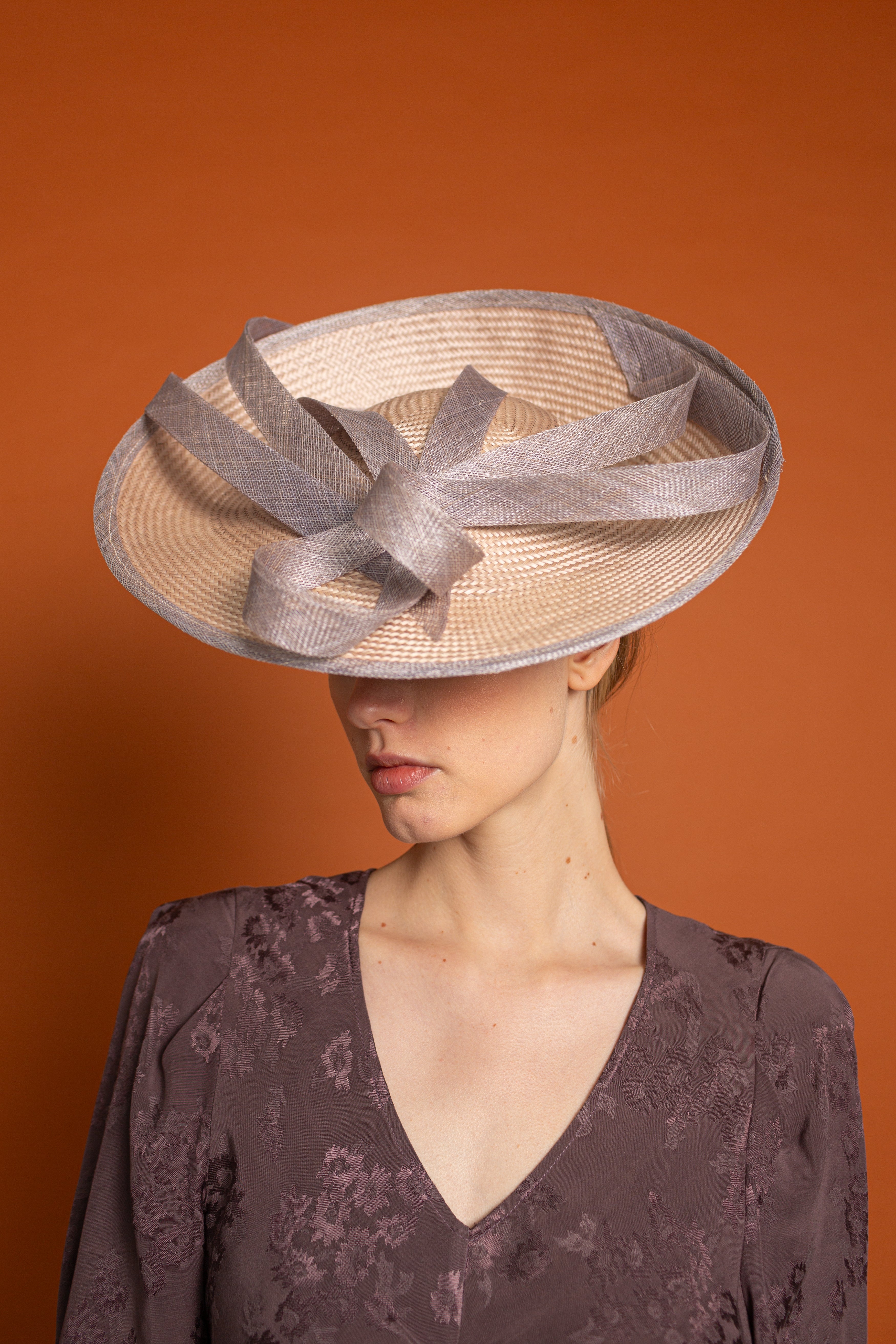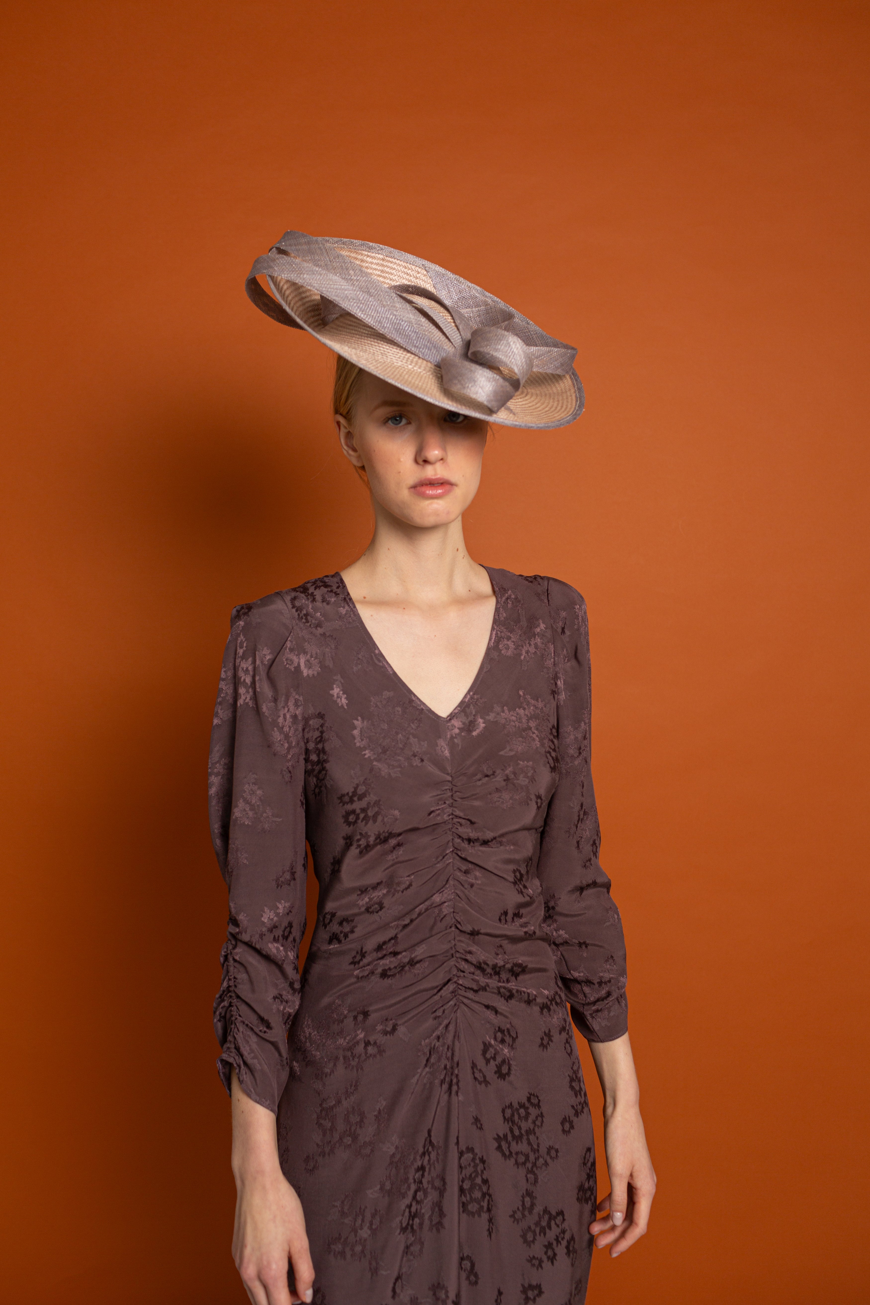 Dulcinea de parasisal grisaceo con ondas de sinamay y bies al tono