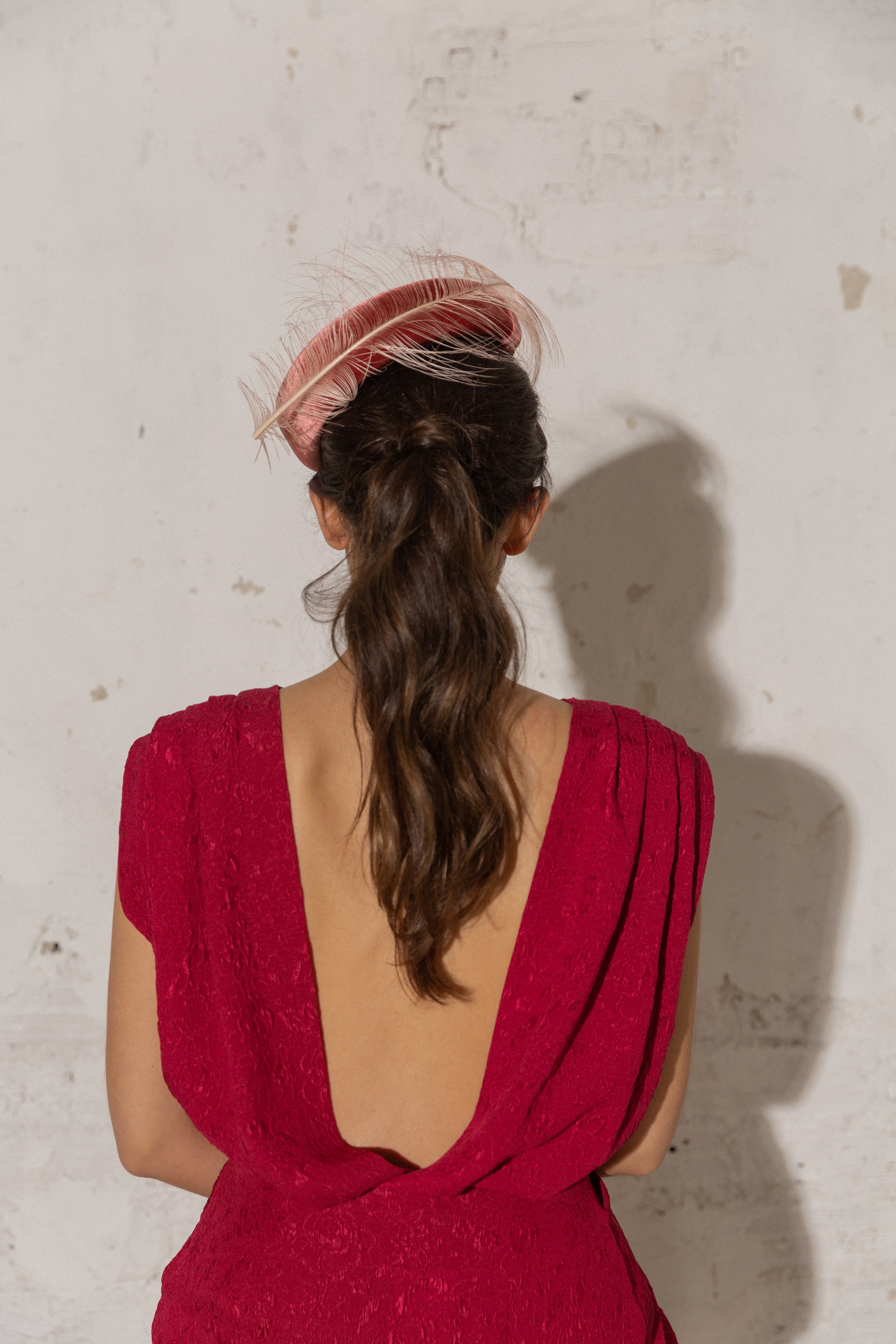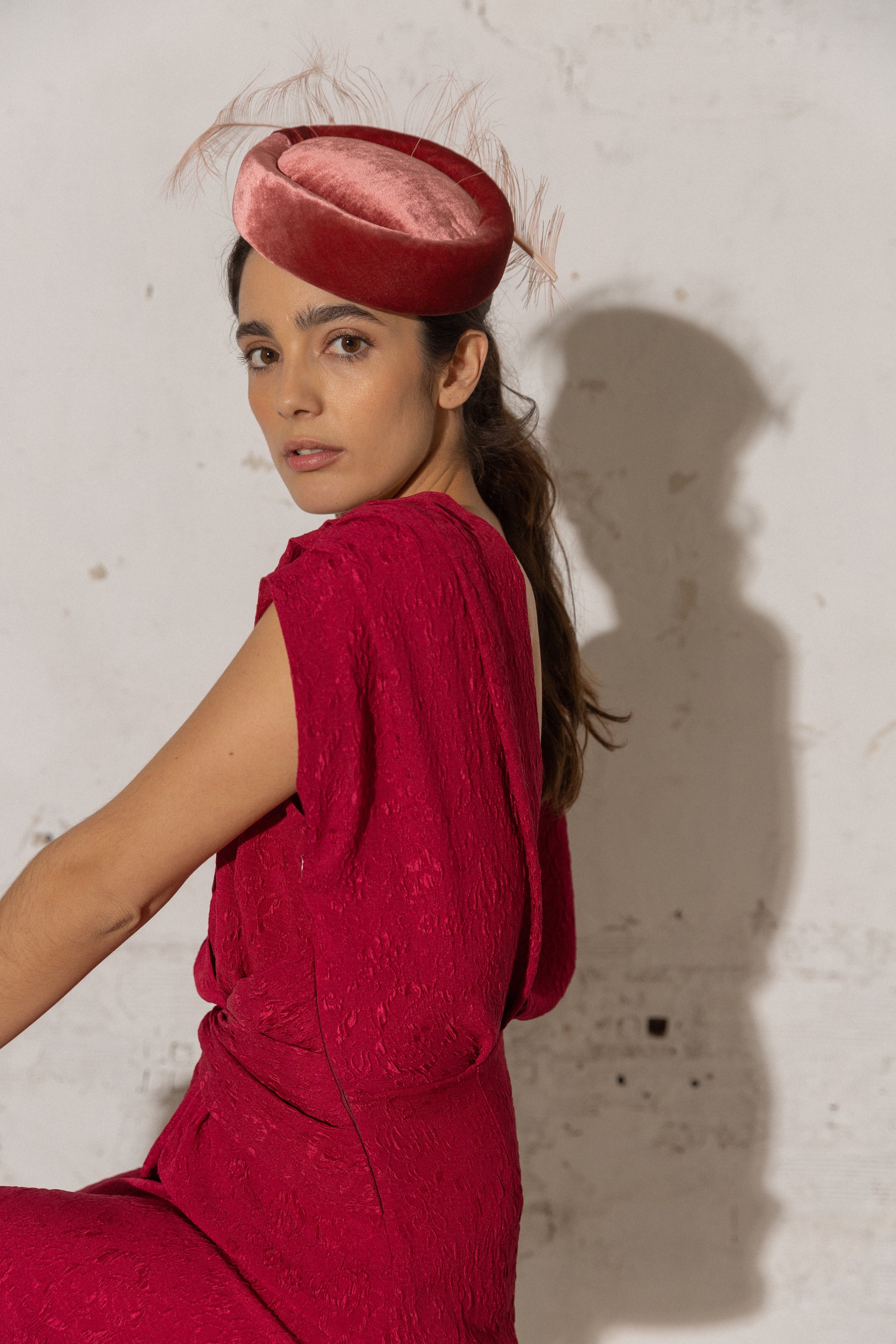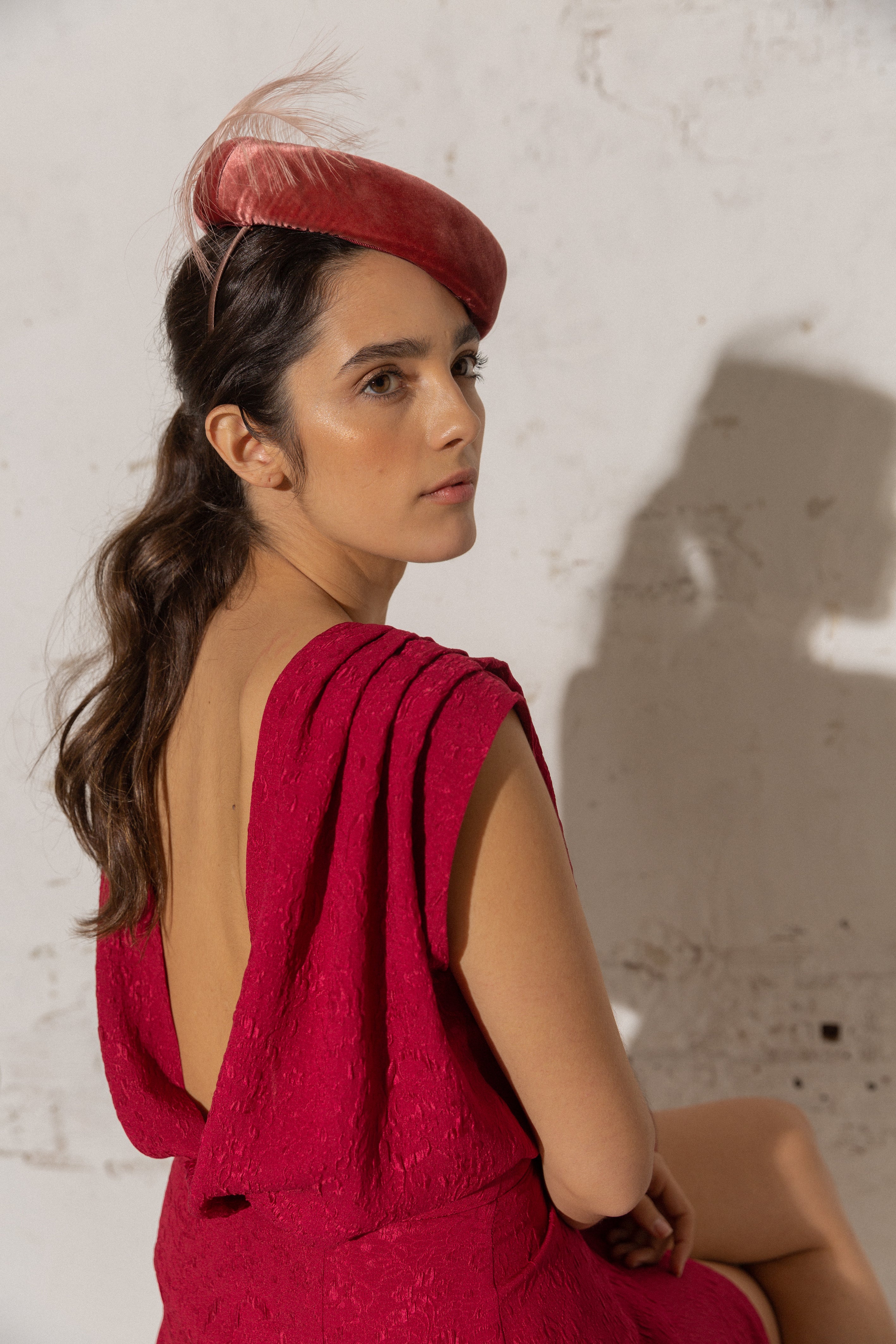 Casquete de terciopelo rosa viejo con pluma trasera nude