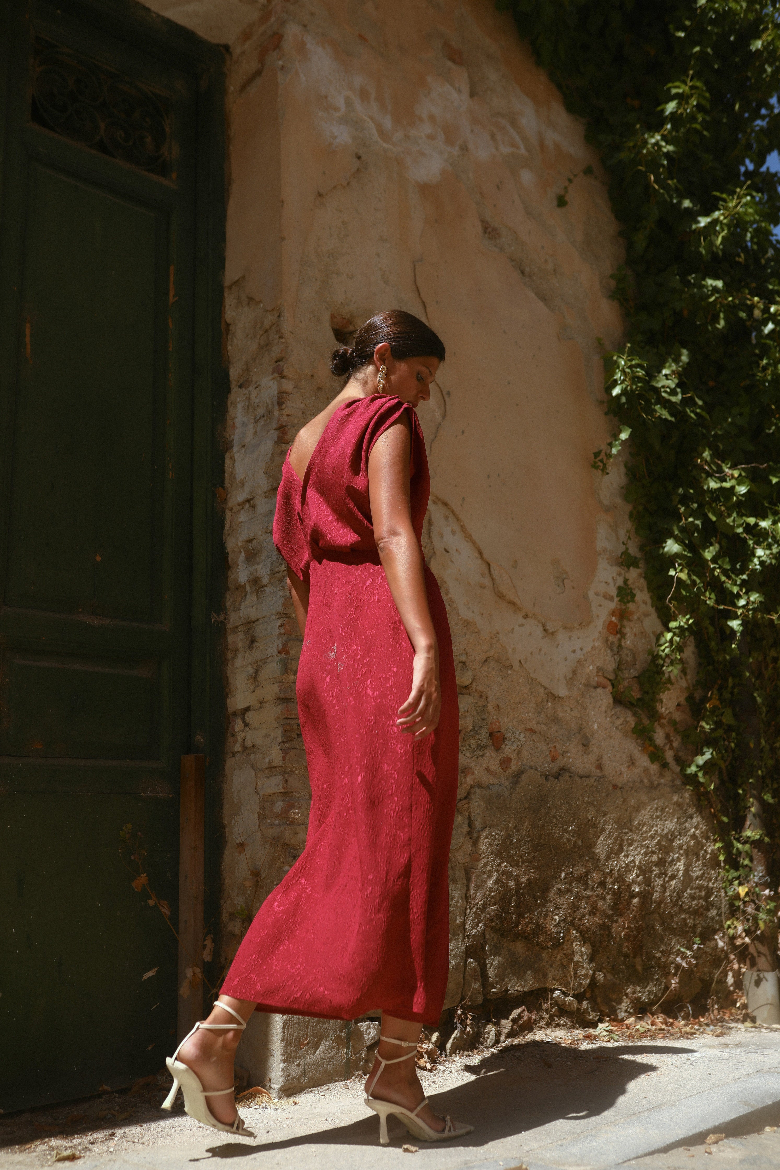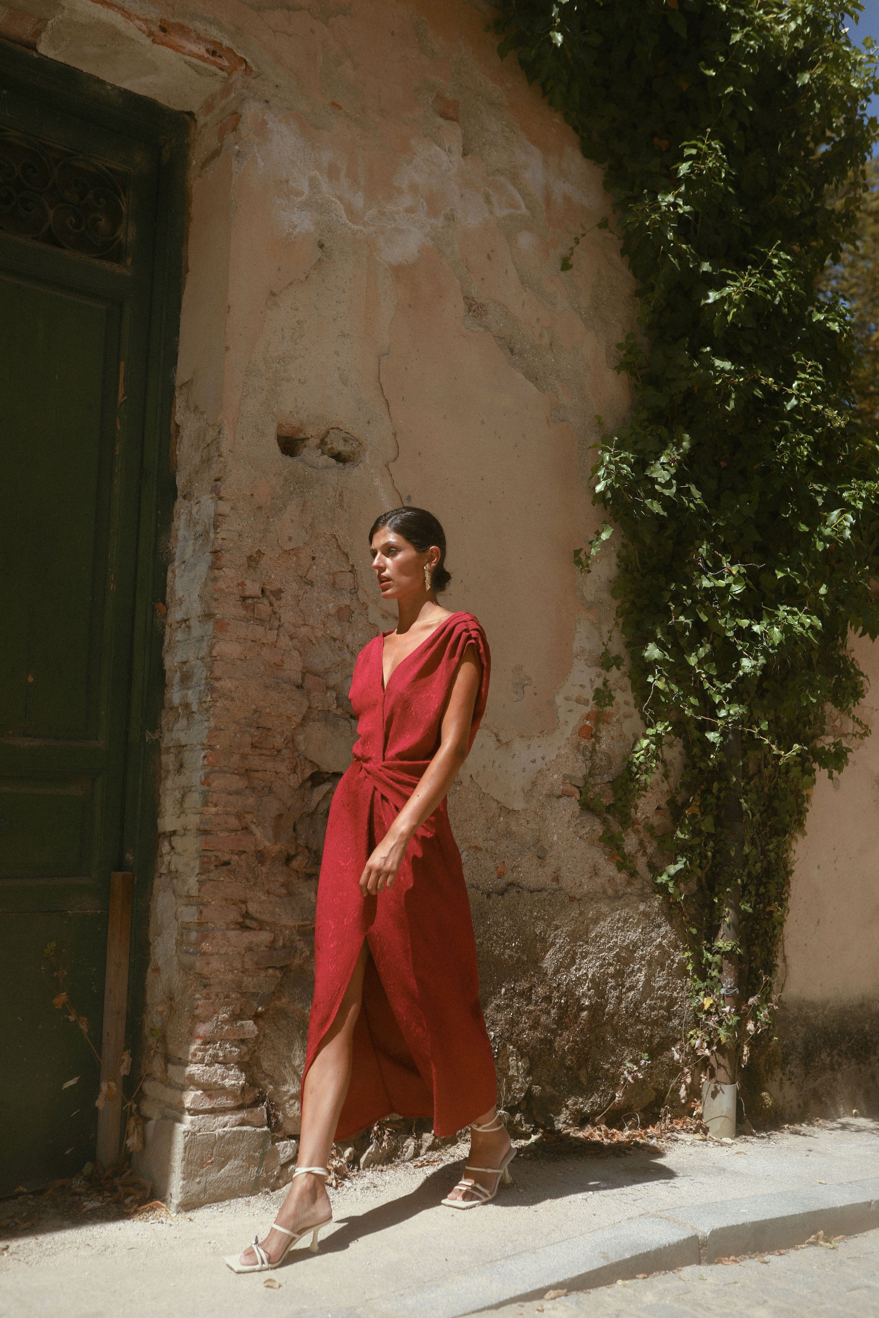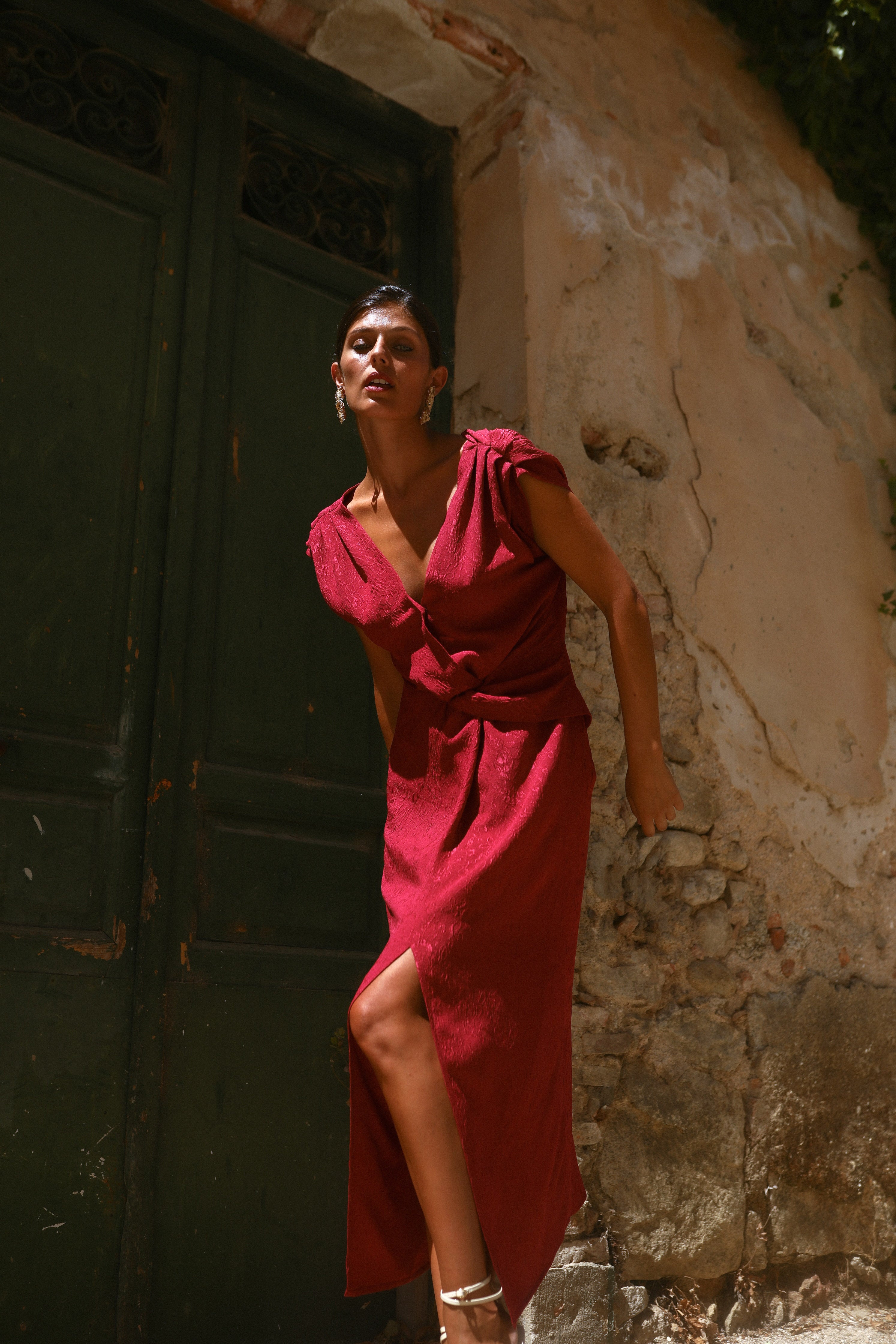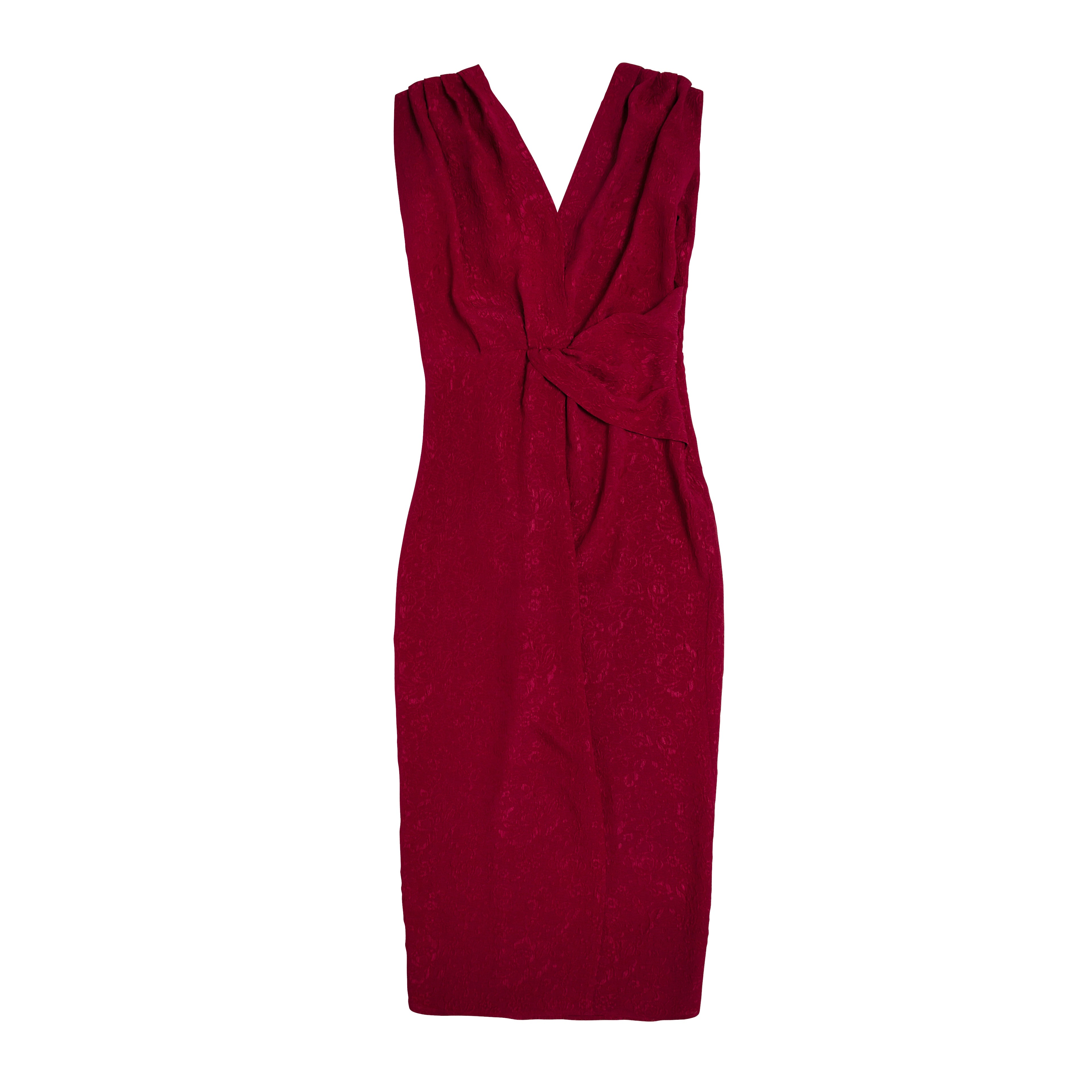 Vestido granate de seda con nudo en la cintura.