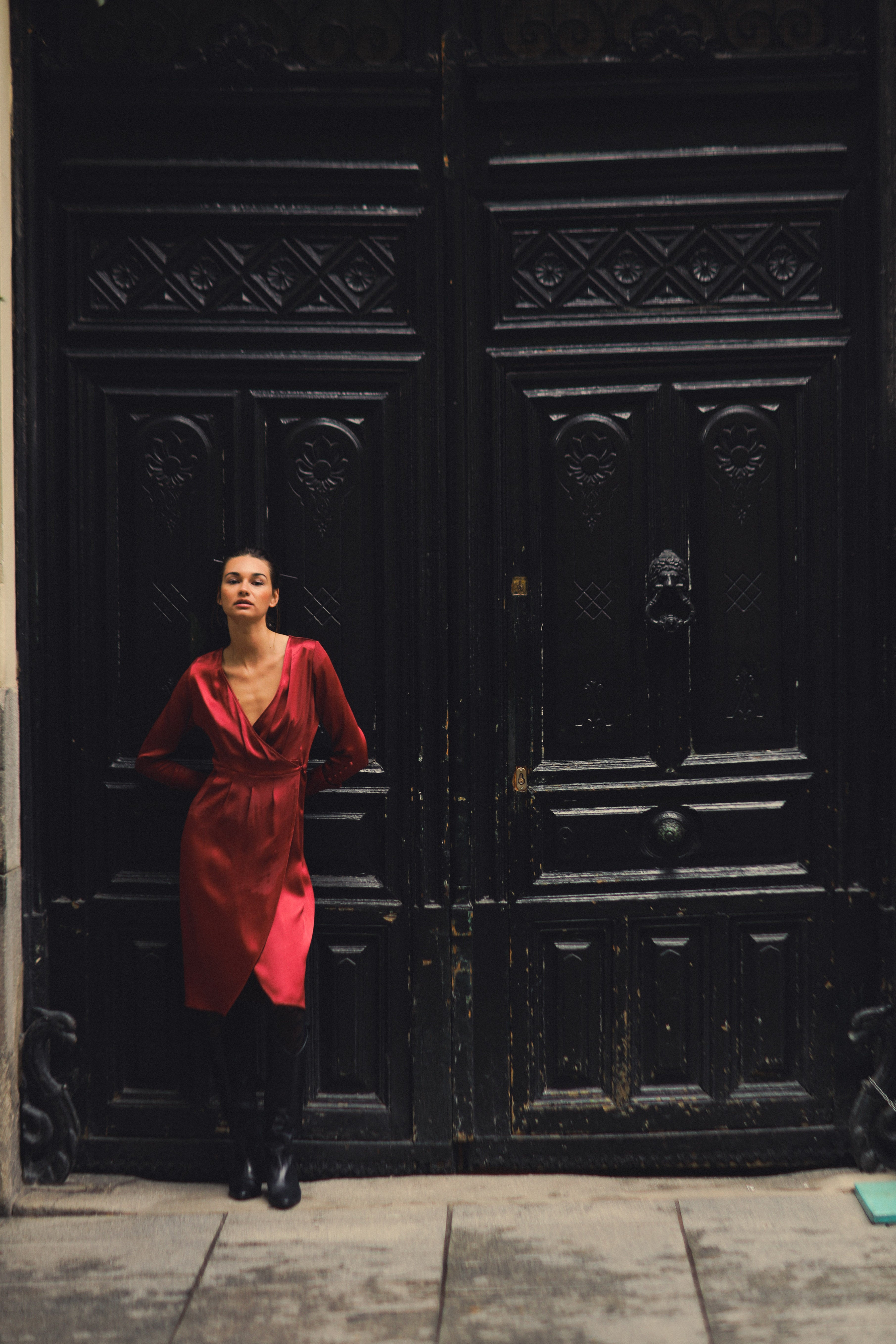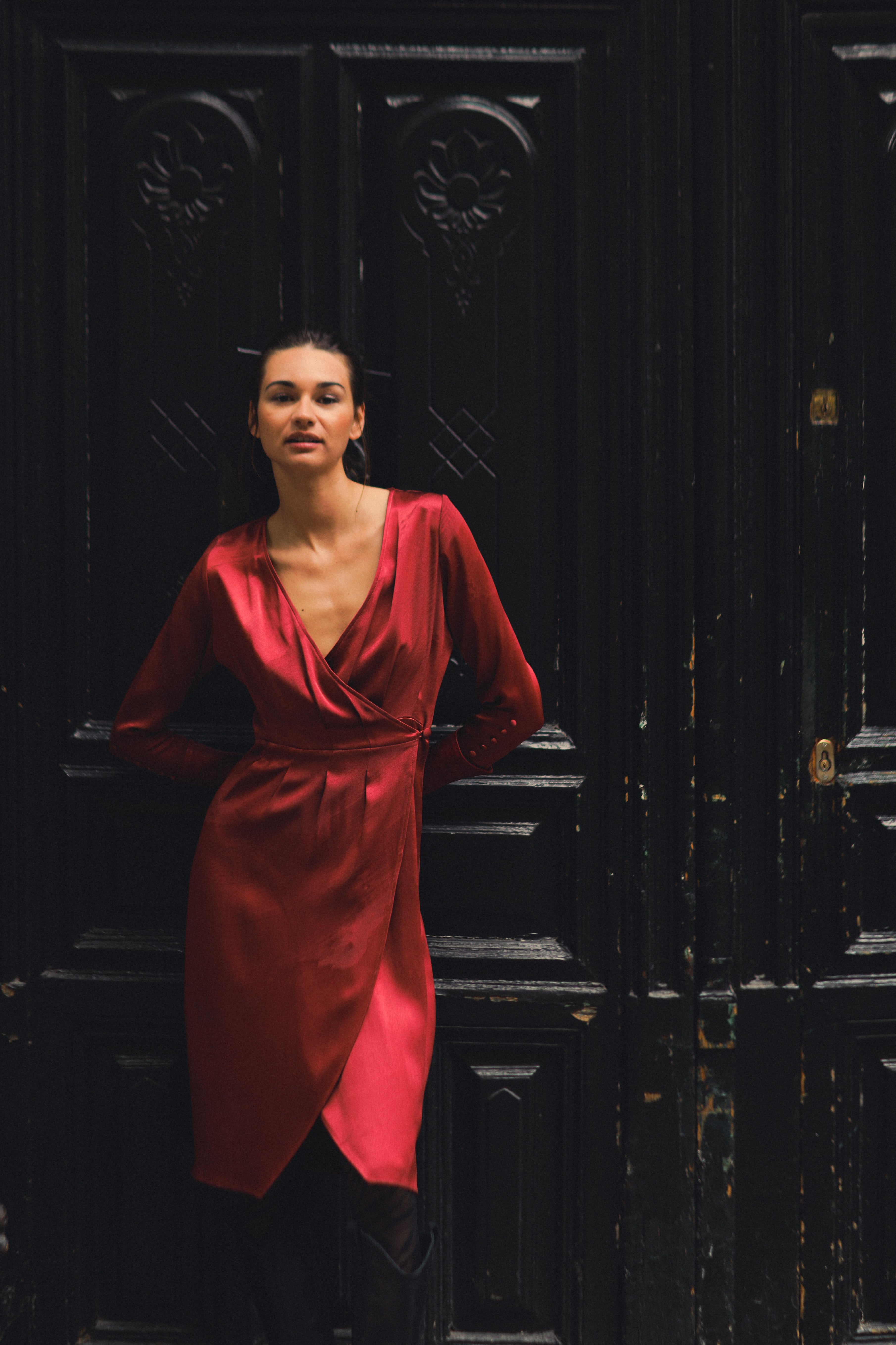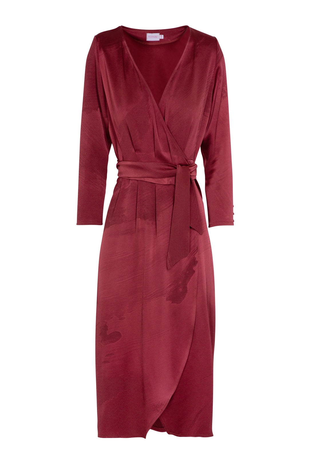 Vestido de manga larga con escote pico y cintura fruncida en color teja.