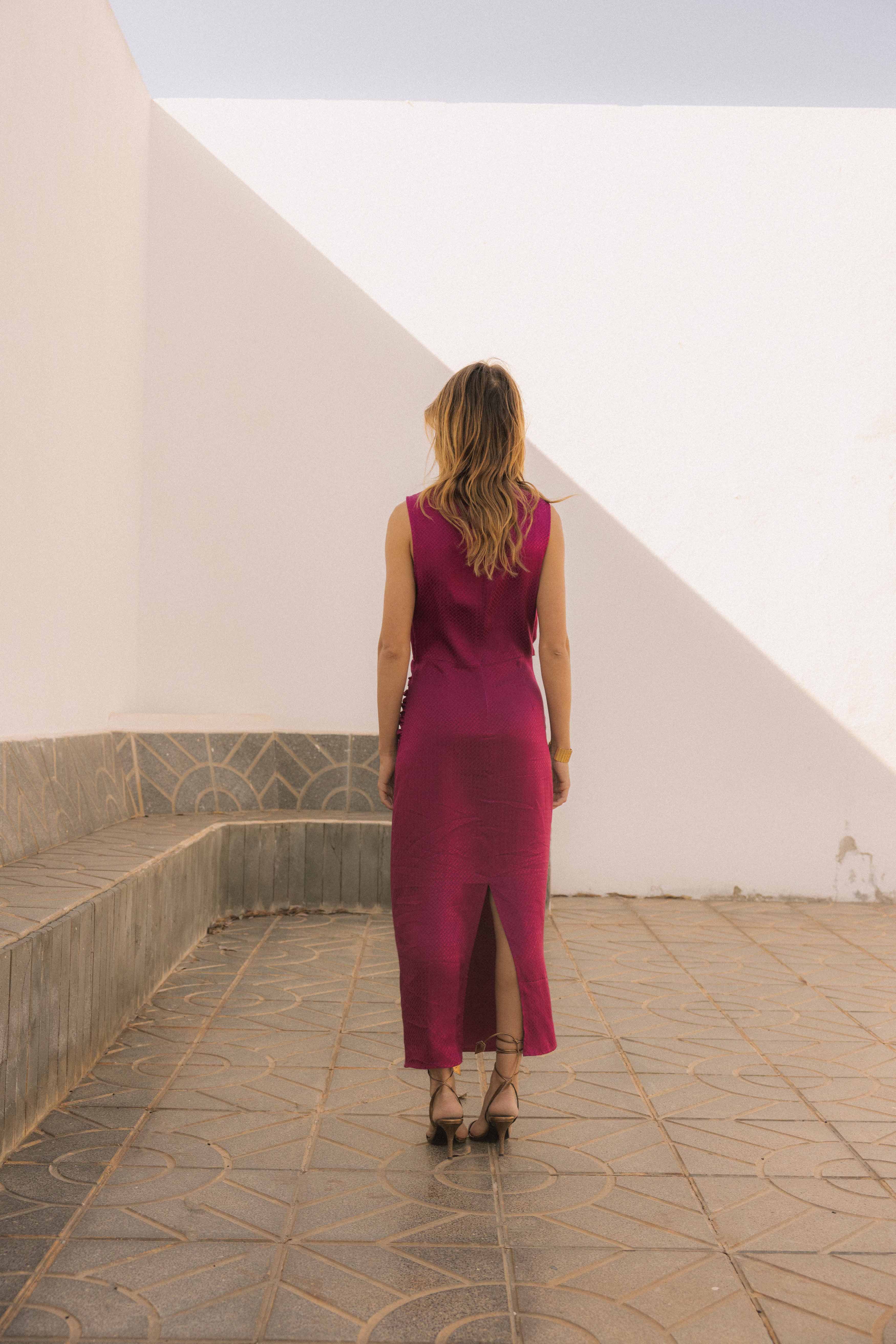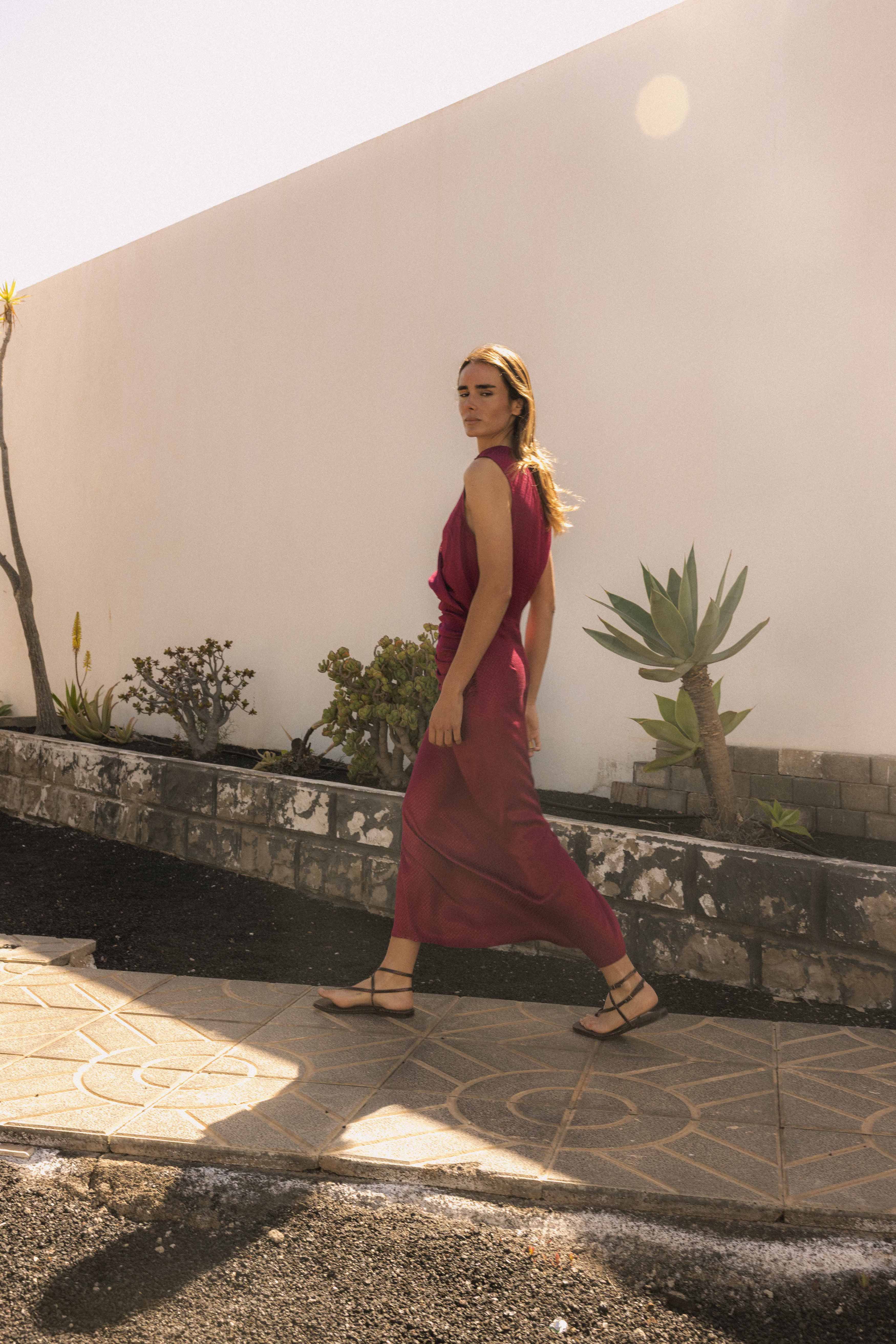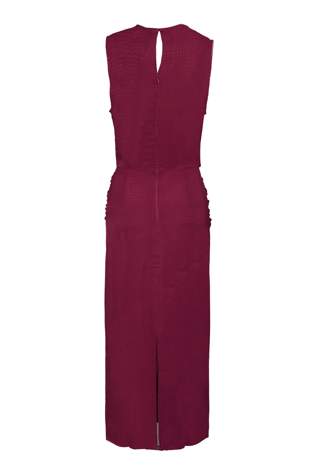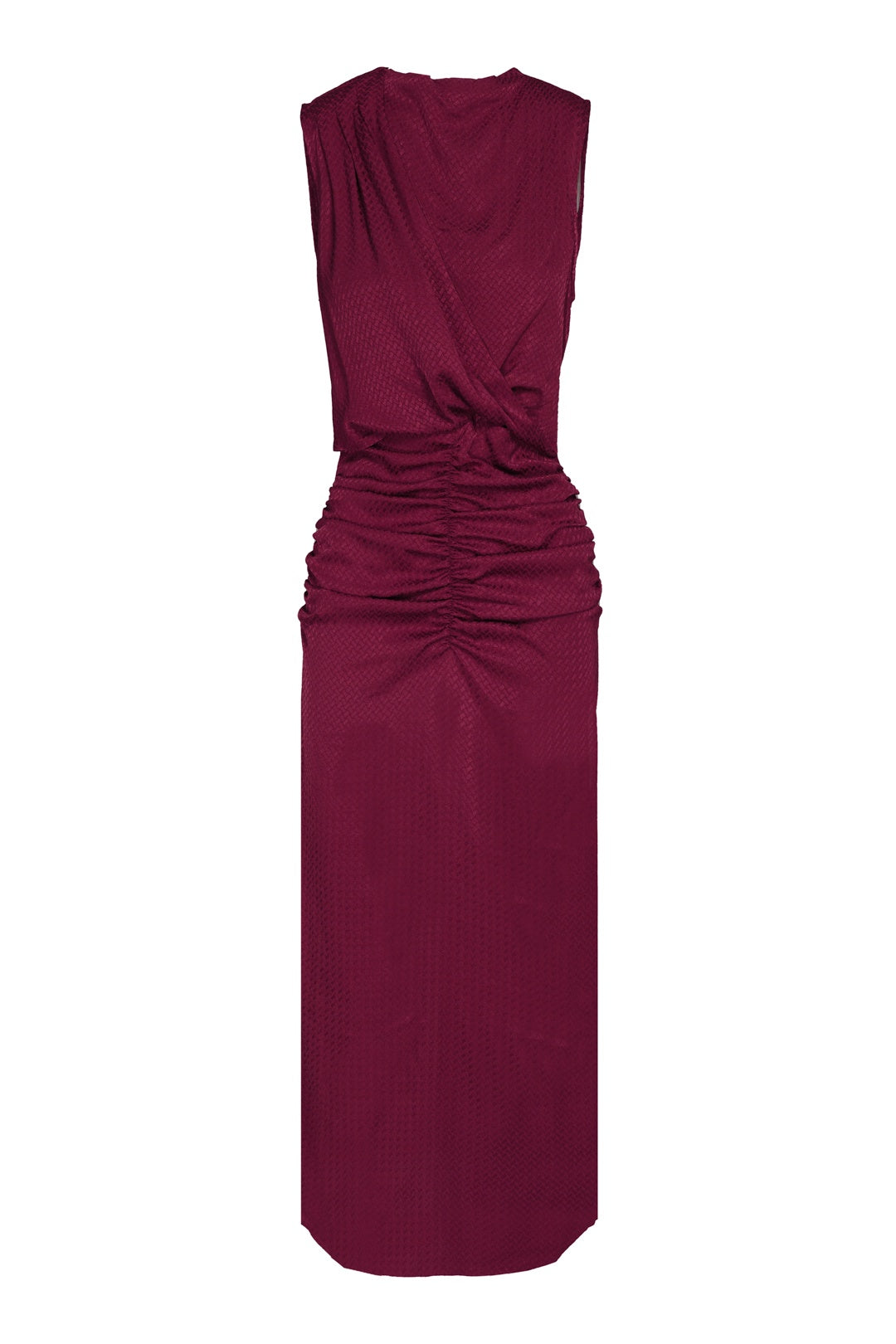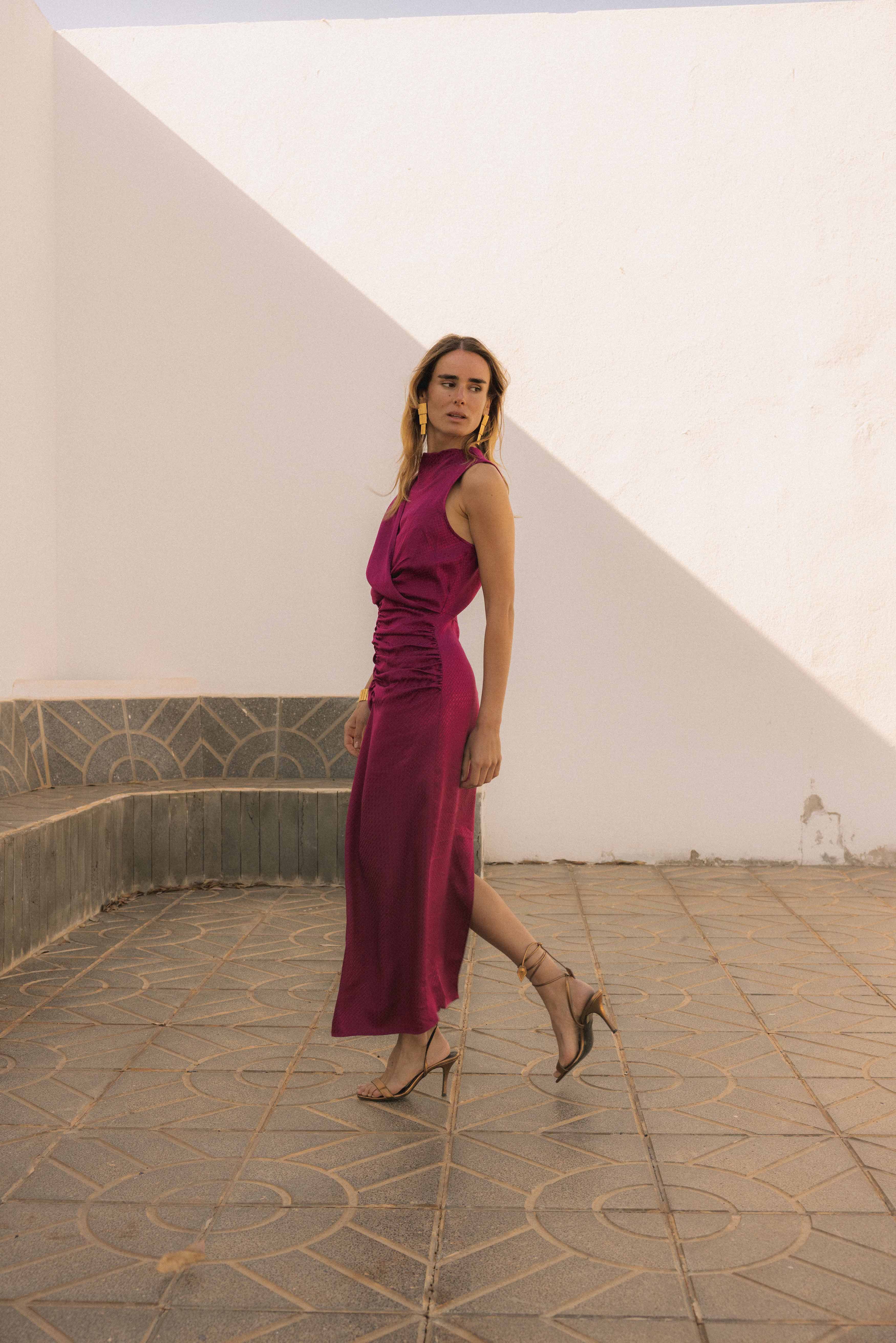 Vestido midi con escote cerrado sin mangas y fruncido delantero.