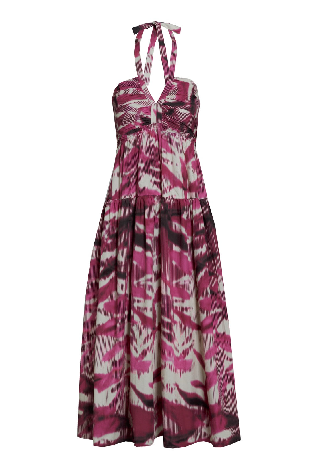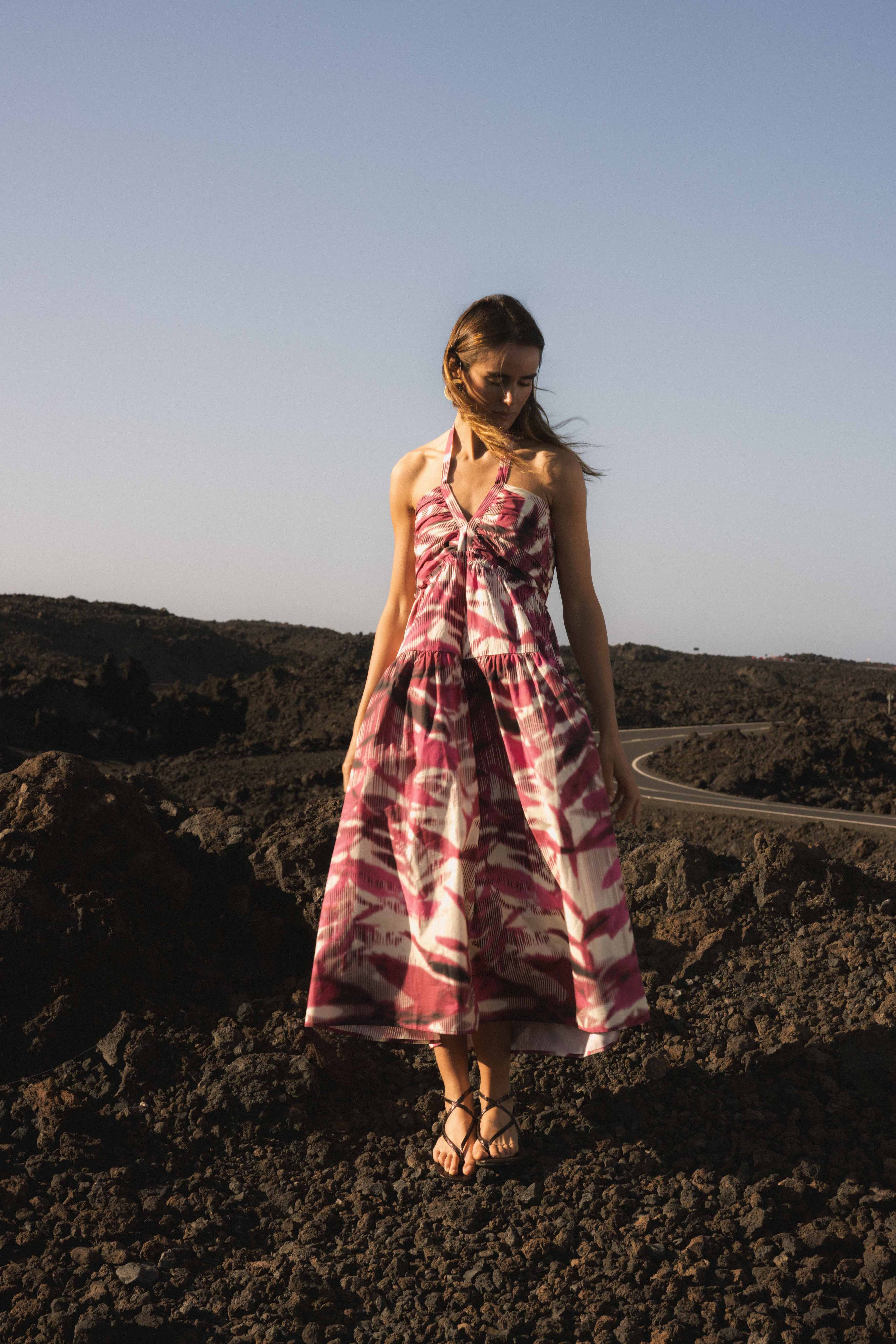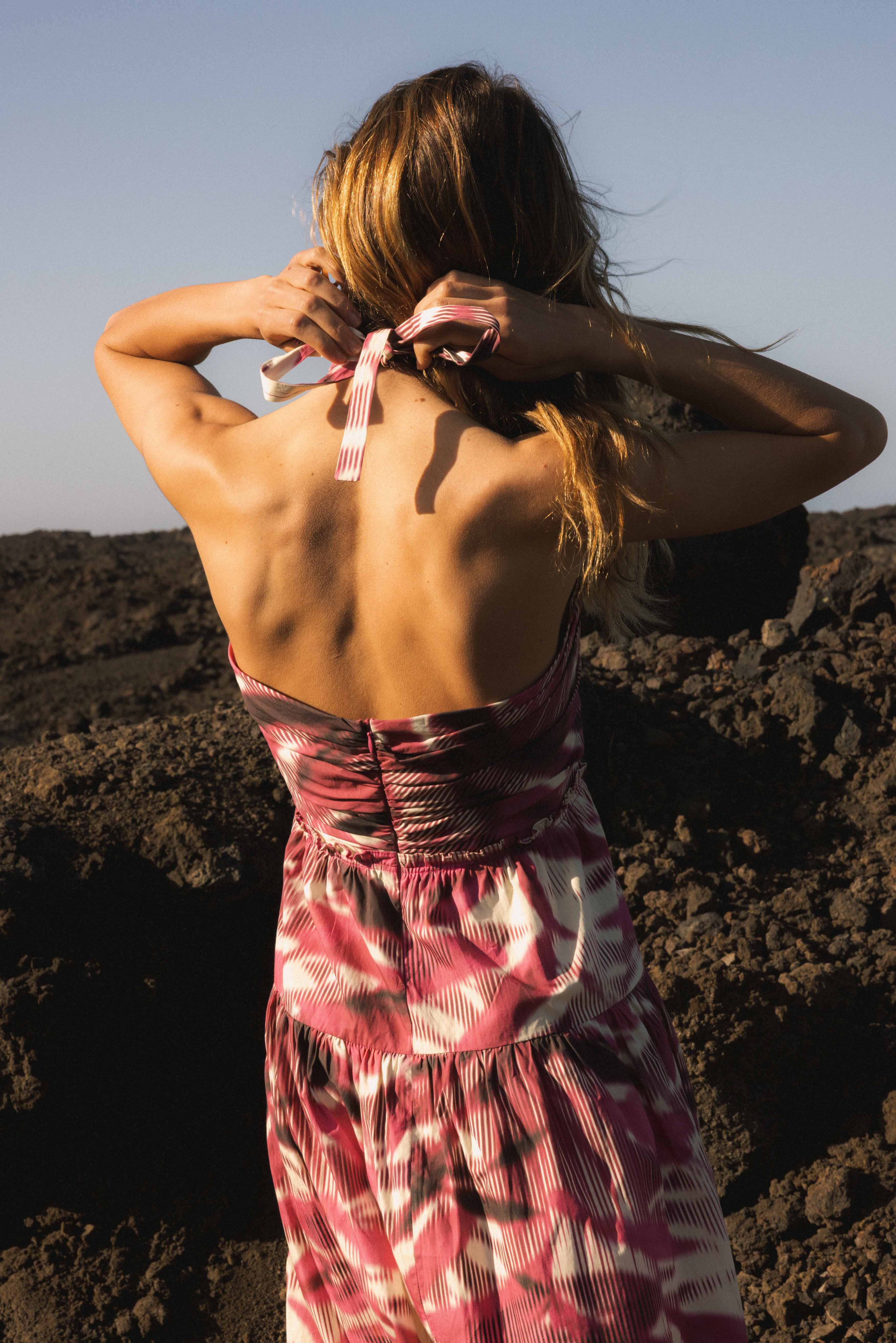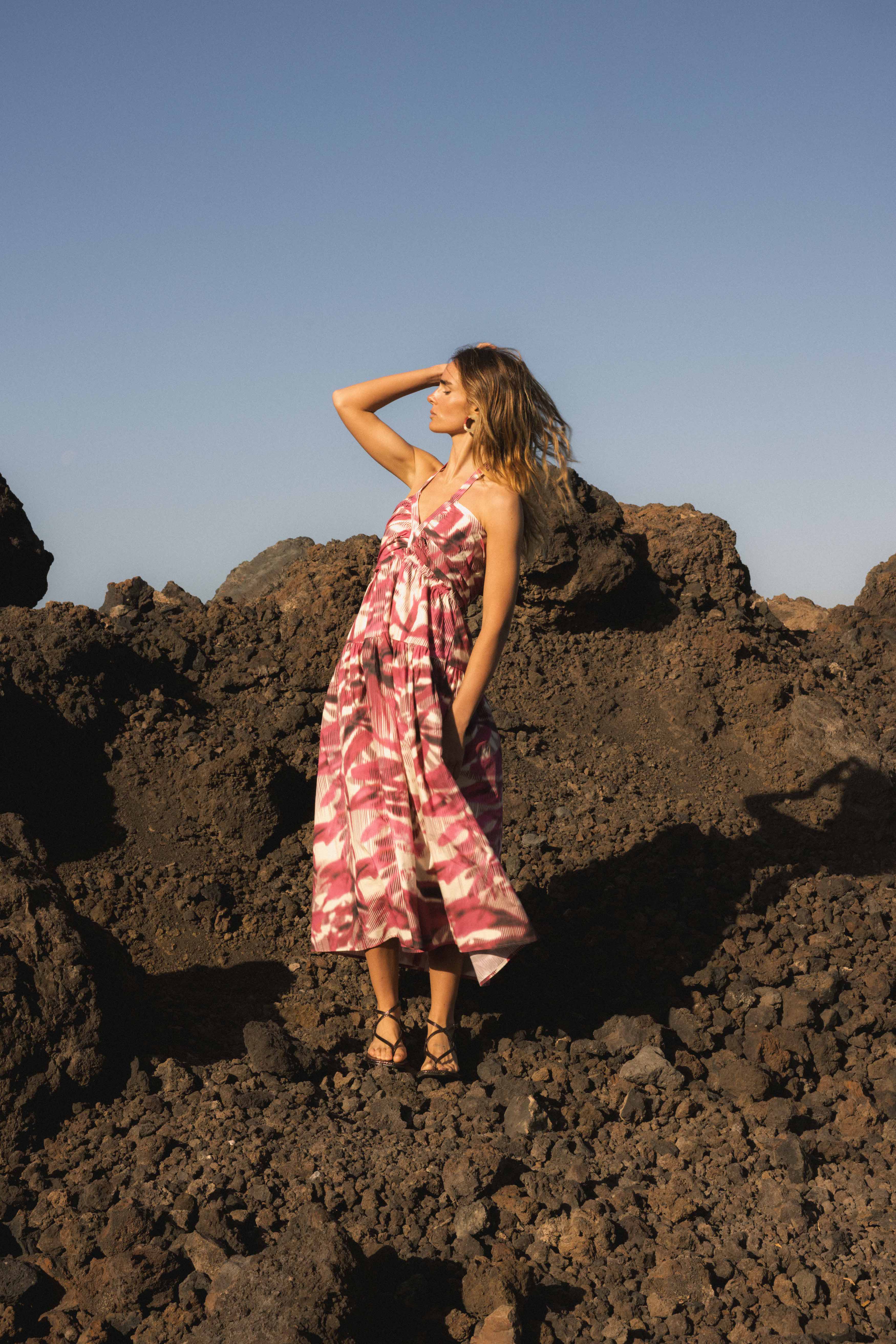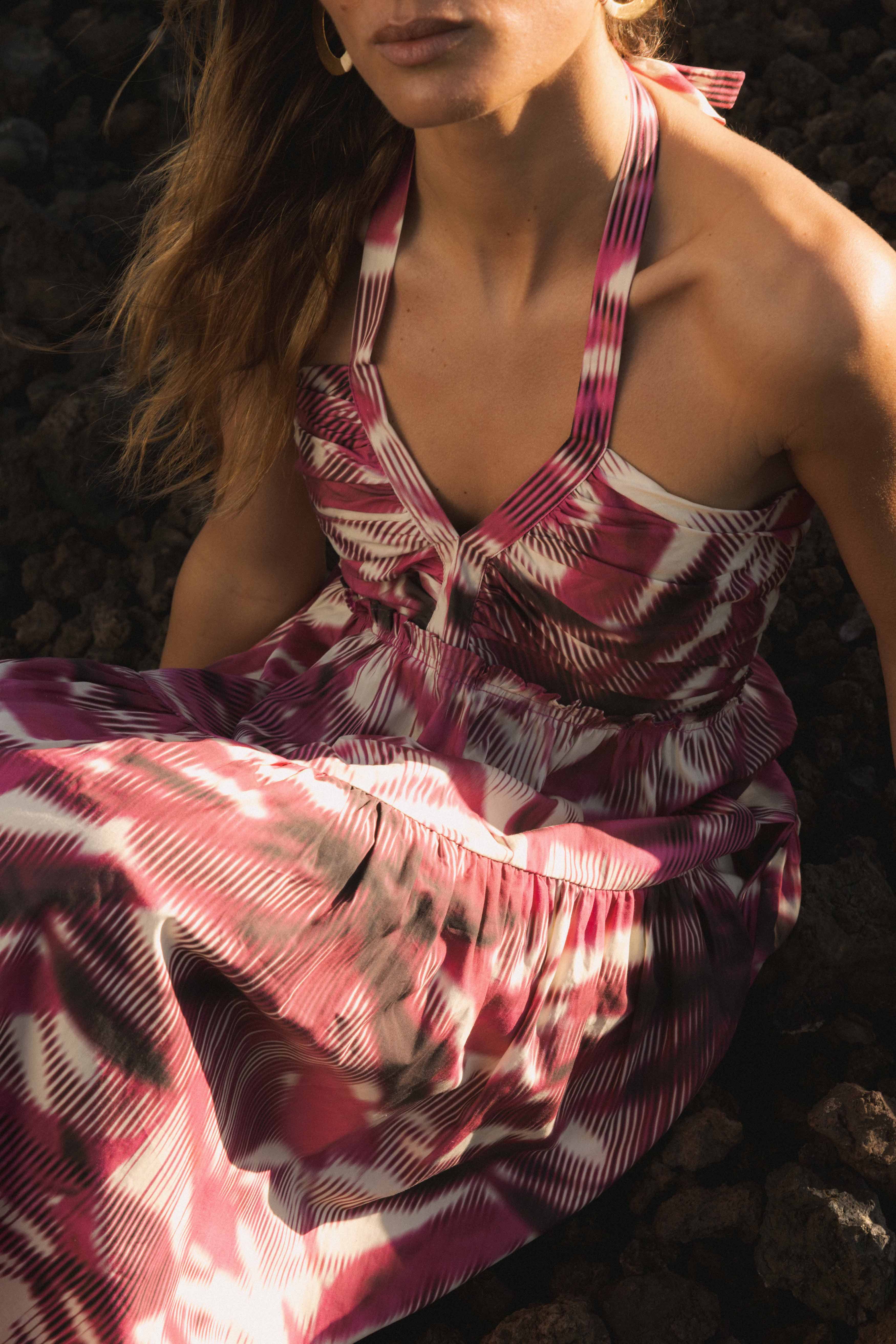 Vestido midi con frunce en el pecho con escote en V y lazada en el cuello.