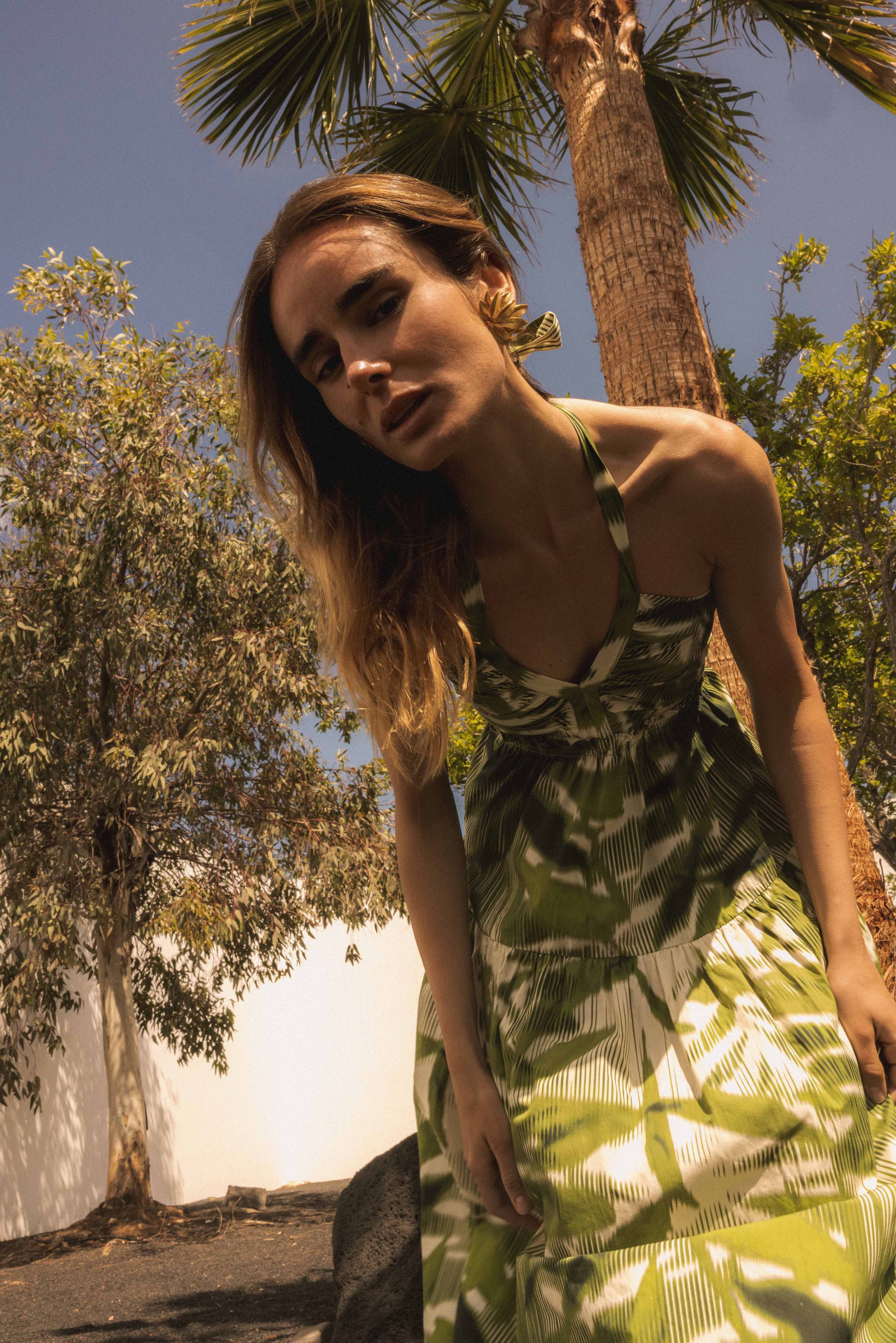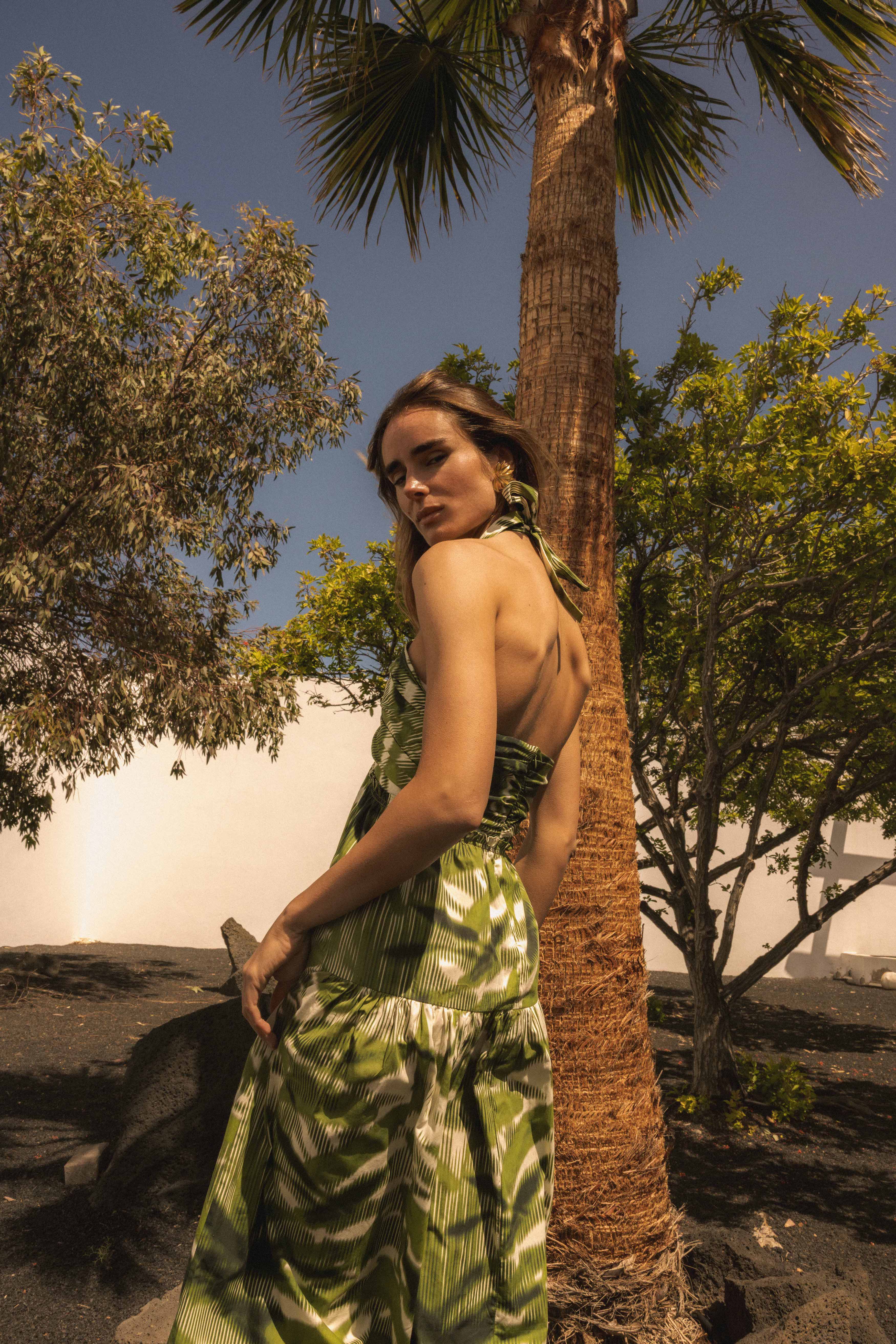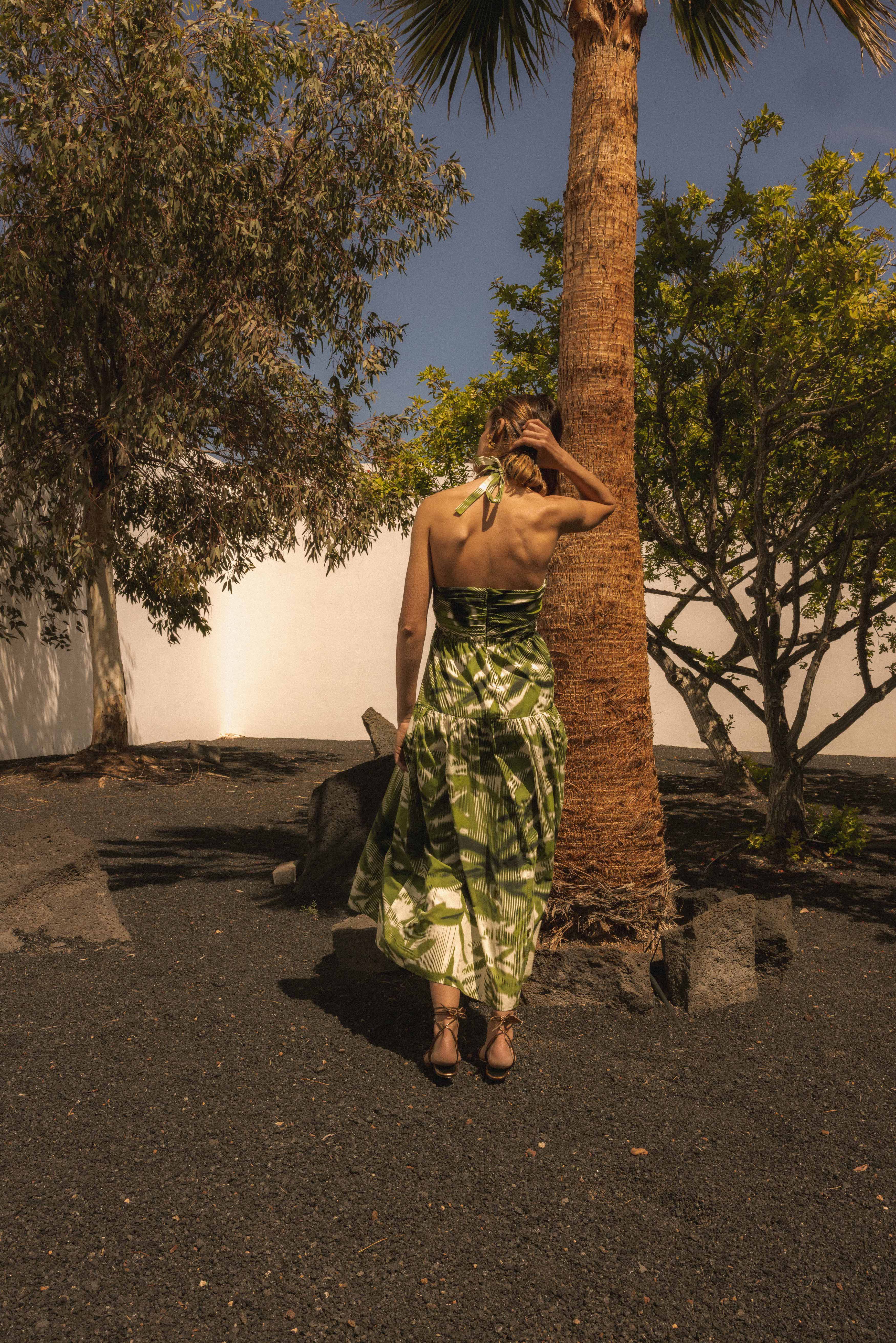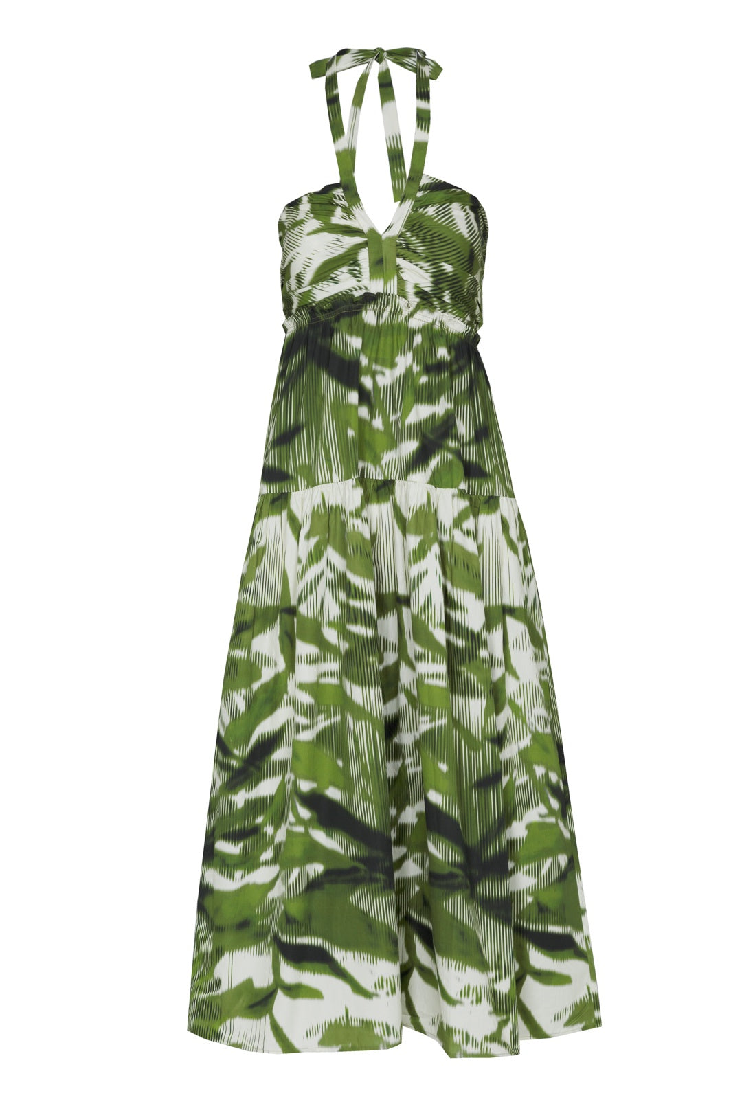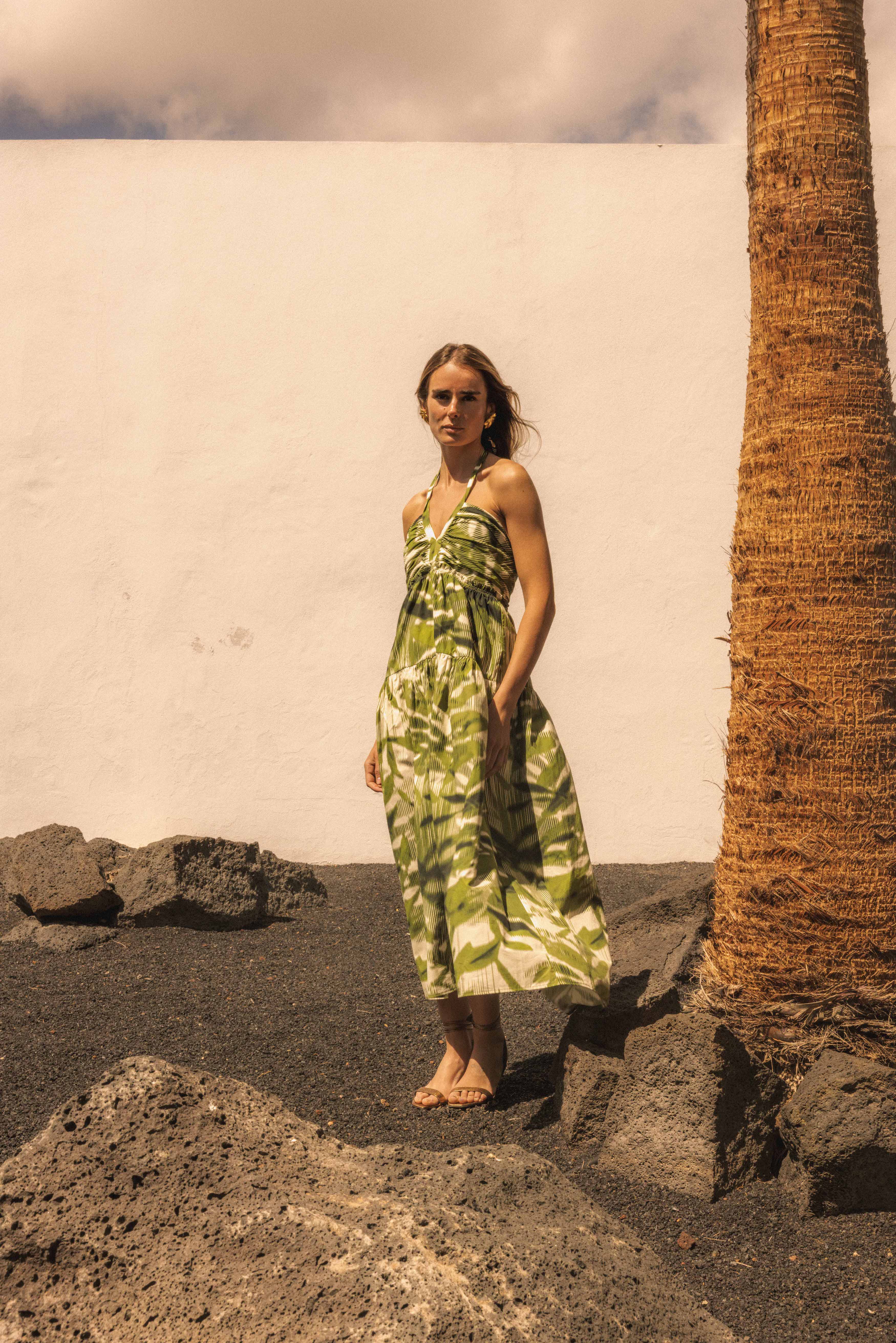 Vestido midi con frunce en el pecho con escote en V y lazada en el cuello.