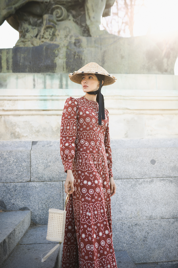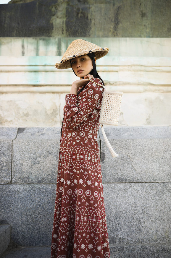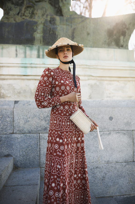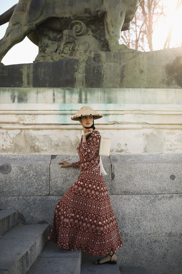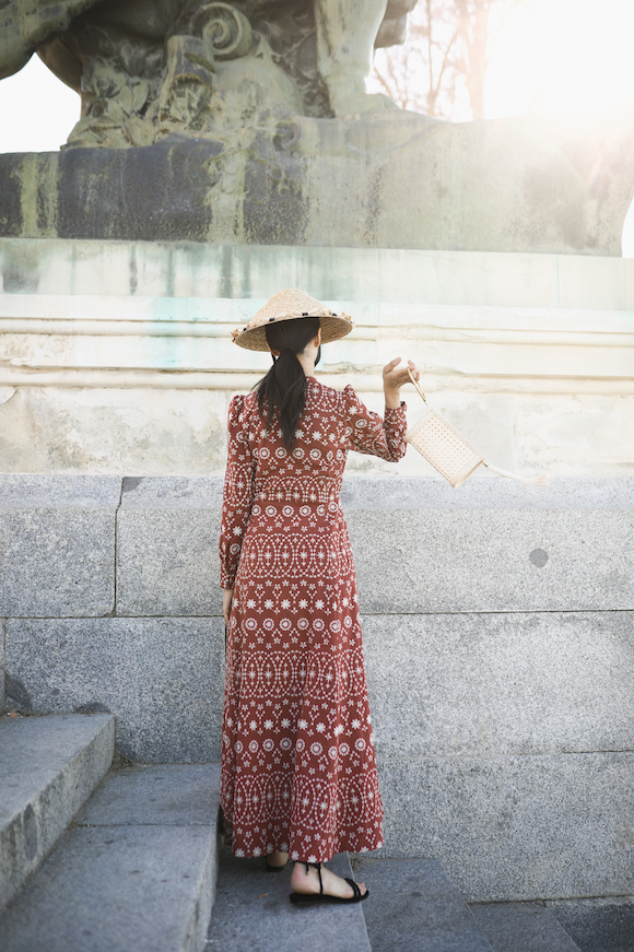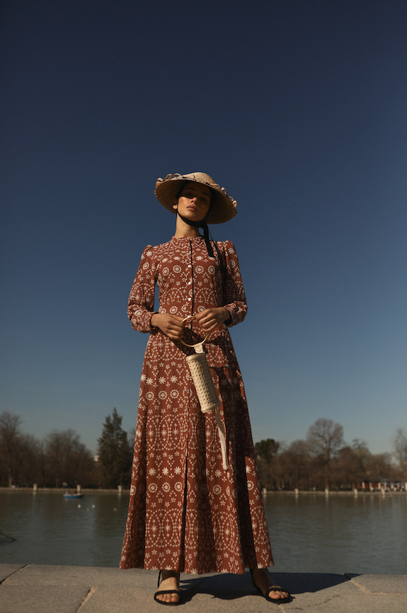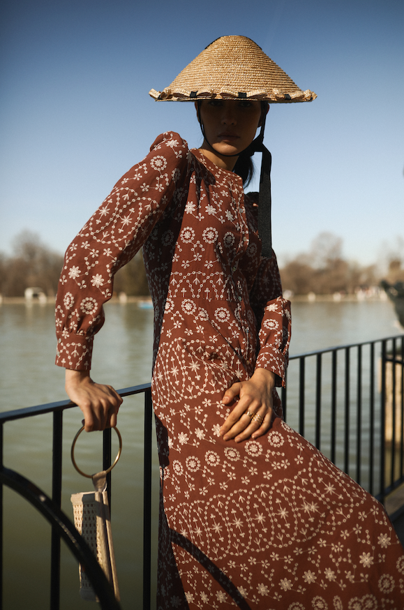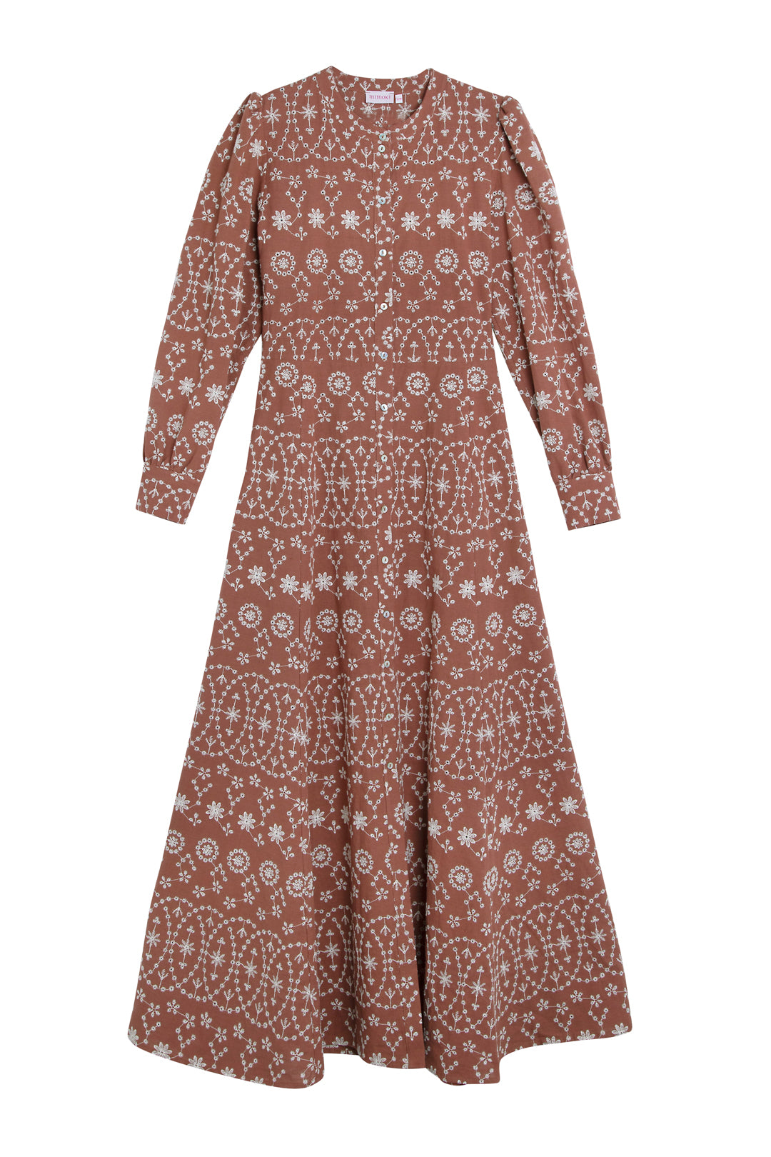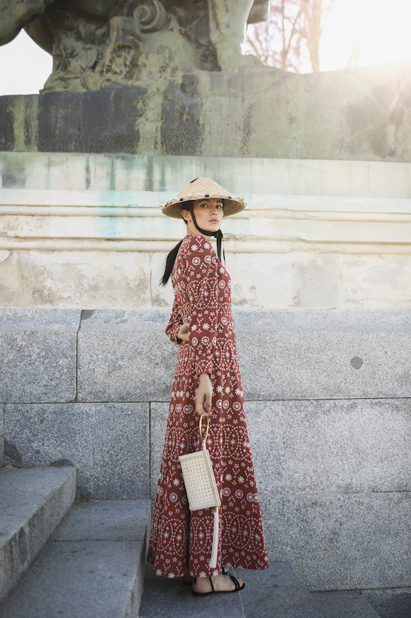 Vestido largo con cierre frontal con botones y corte en la cintura.