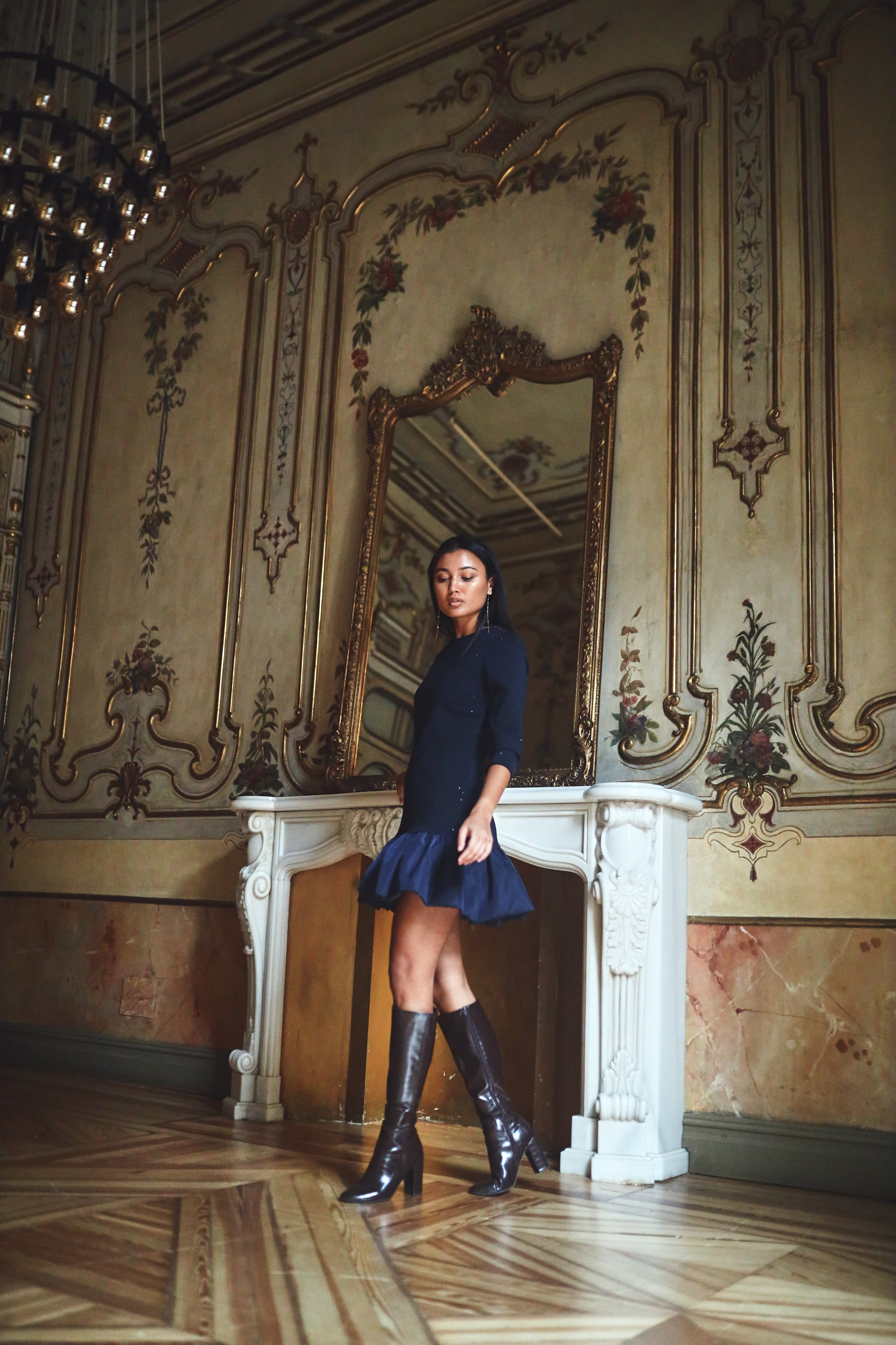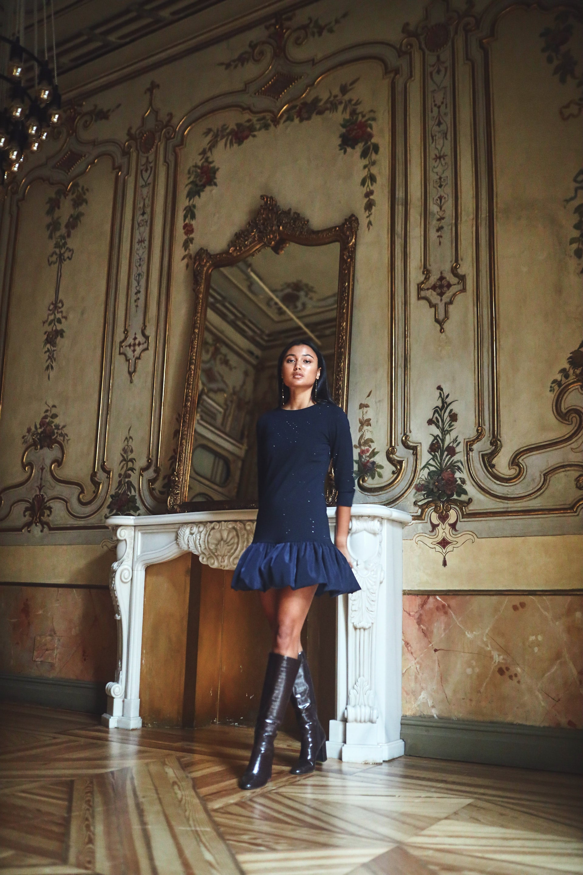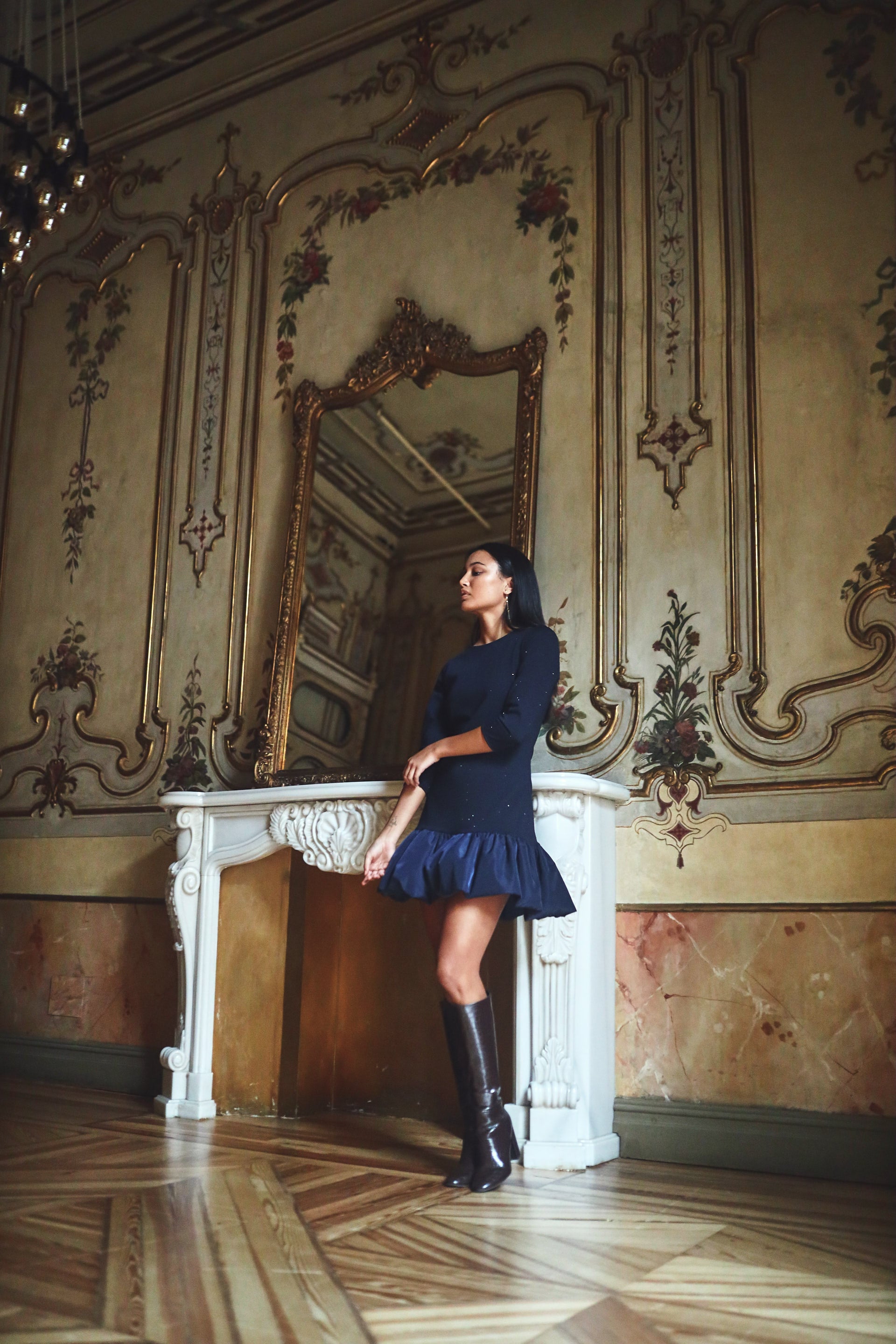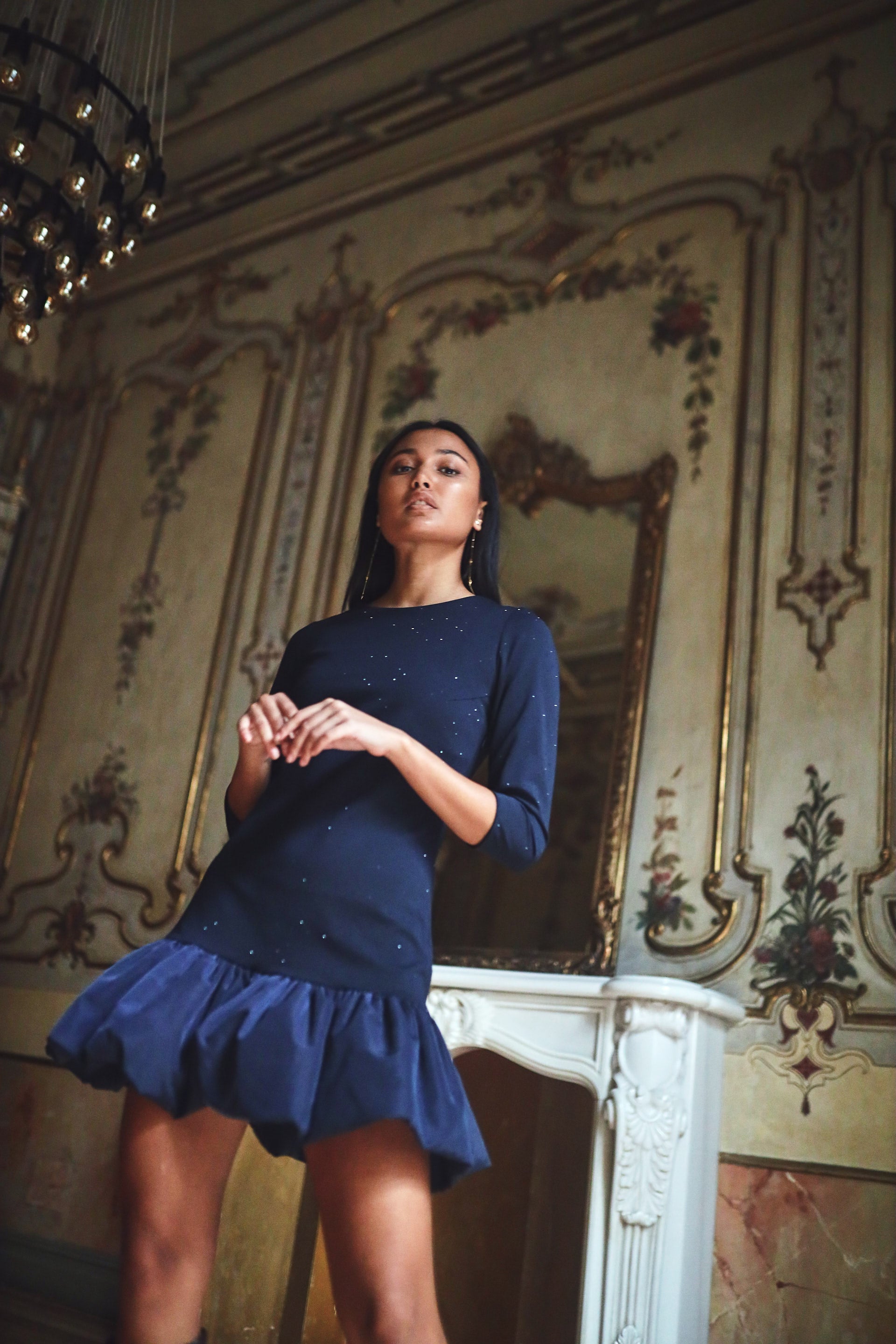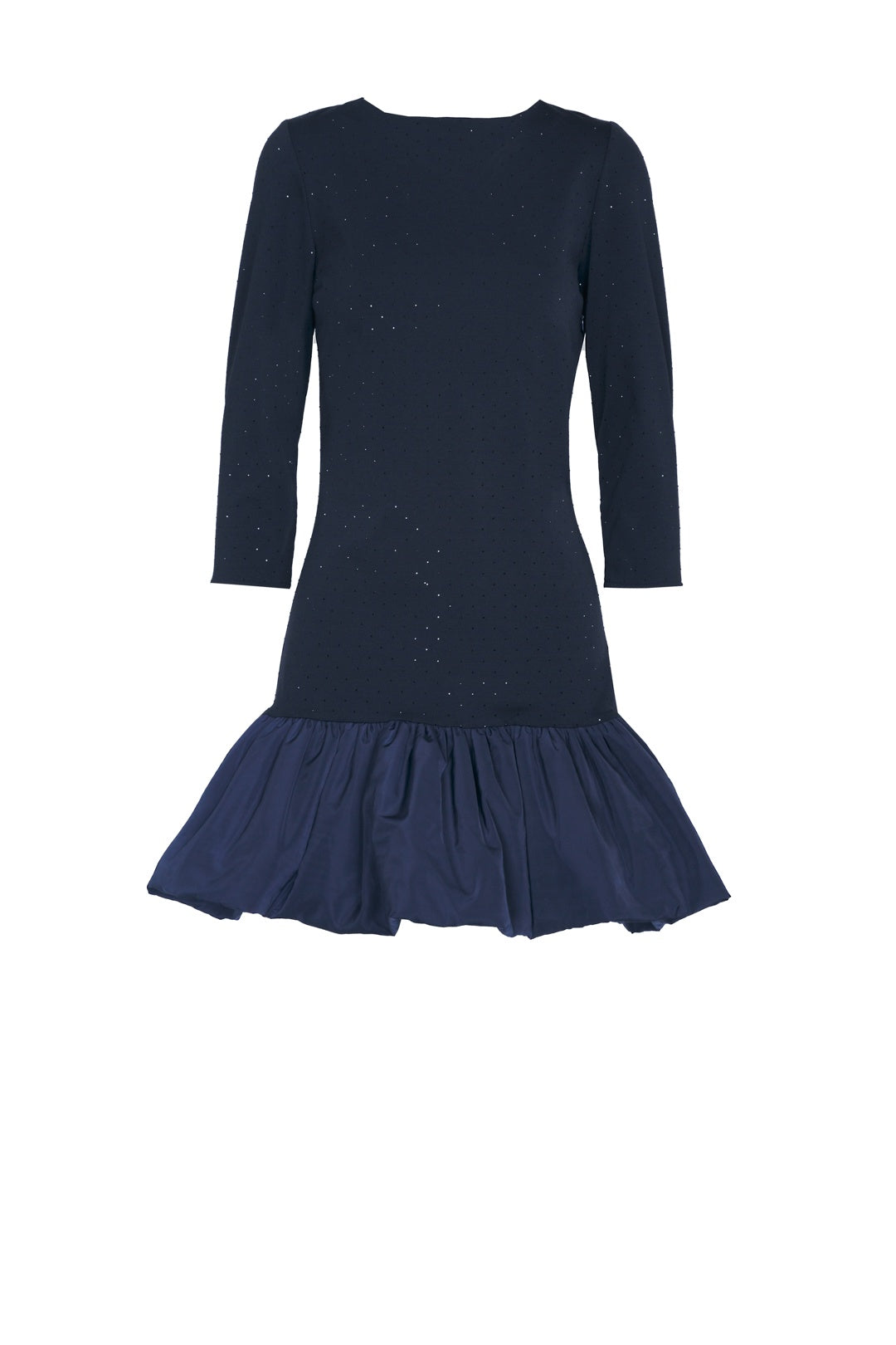 Vestido corto con volante, manga francesa y abertura en espalda.