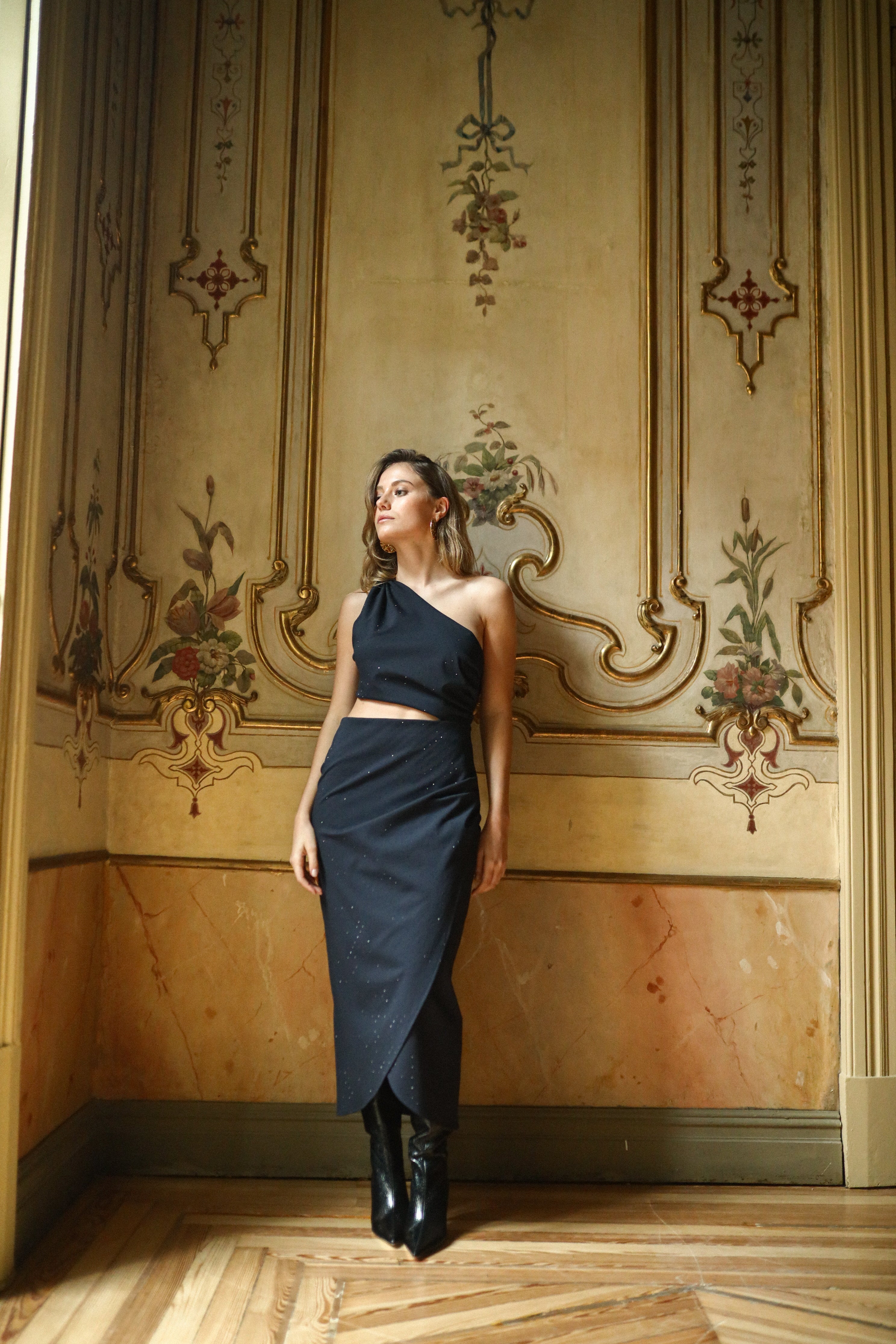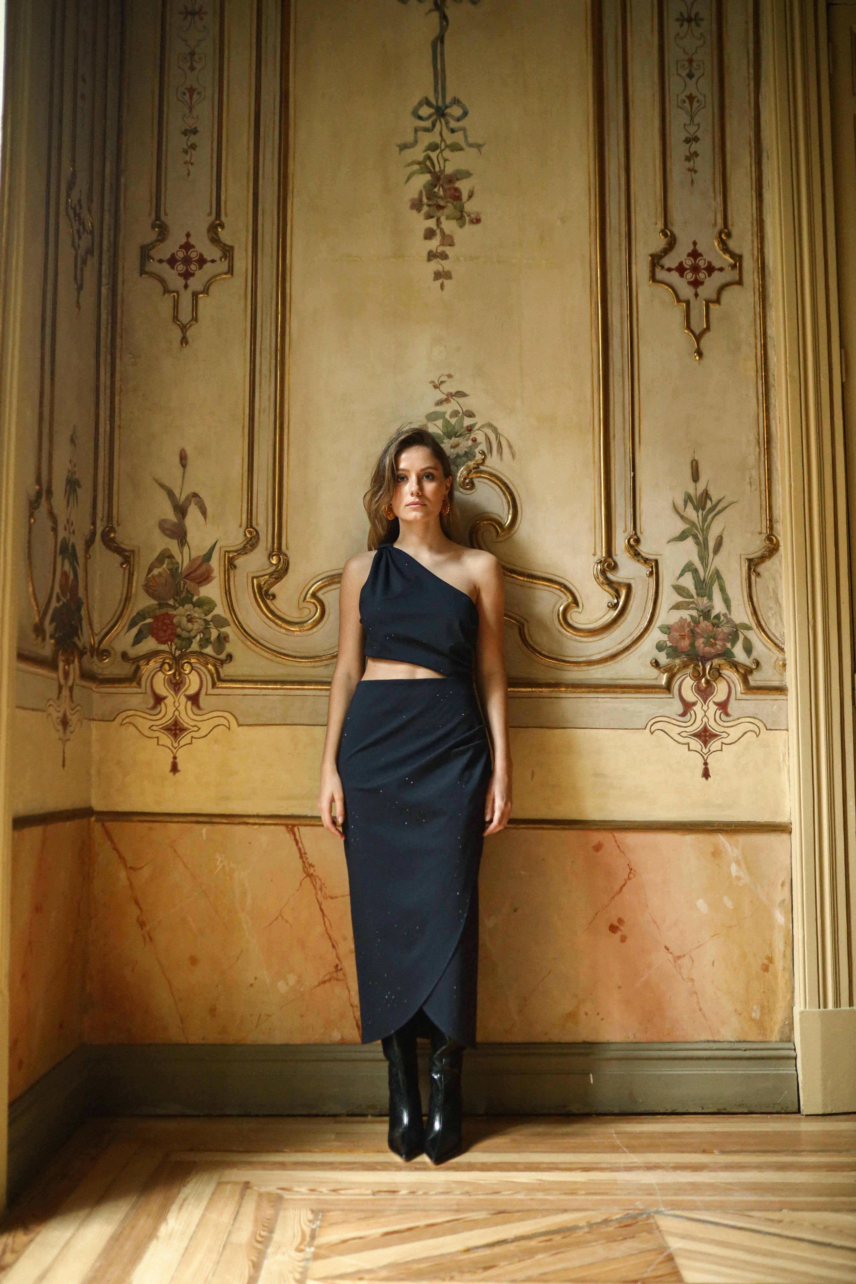 Vestido cut out midi con escote asimétrico, sin mangas y escote asimétrico