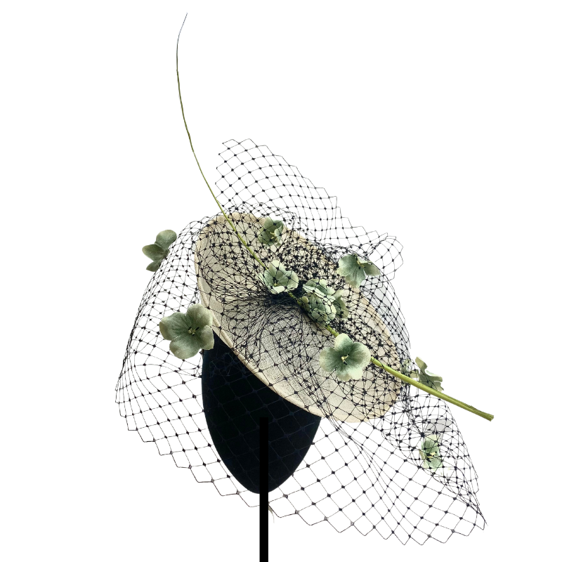 Dulcinea de sinamay natural con velo ancho modelado, flores esparcidas verdes y raqui al tono